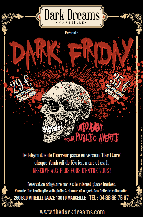 “Adeptes de sensations fortes et de grands frissons : vivez vos pires cauchemars au travers d’un spectacle hanté des plus réalistes ! Acteurs, effets spéciaux, décors immersifs et interactifs, Dark Dreams vous propose une aventure hors du commun. Le parcours, semé d’embuches, vous réservera de nombreuses surprises ! Personne ne sait quand et comment vous en ressortirez… En groupe de 2 à 12 joueurs, venez relever le défi dans ce labyrinthe de l’horreur de 600m2 !”