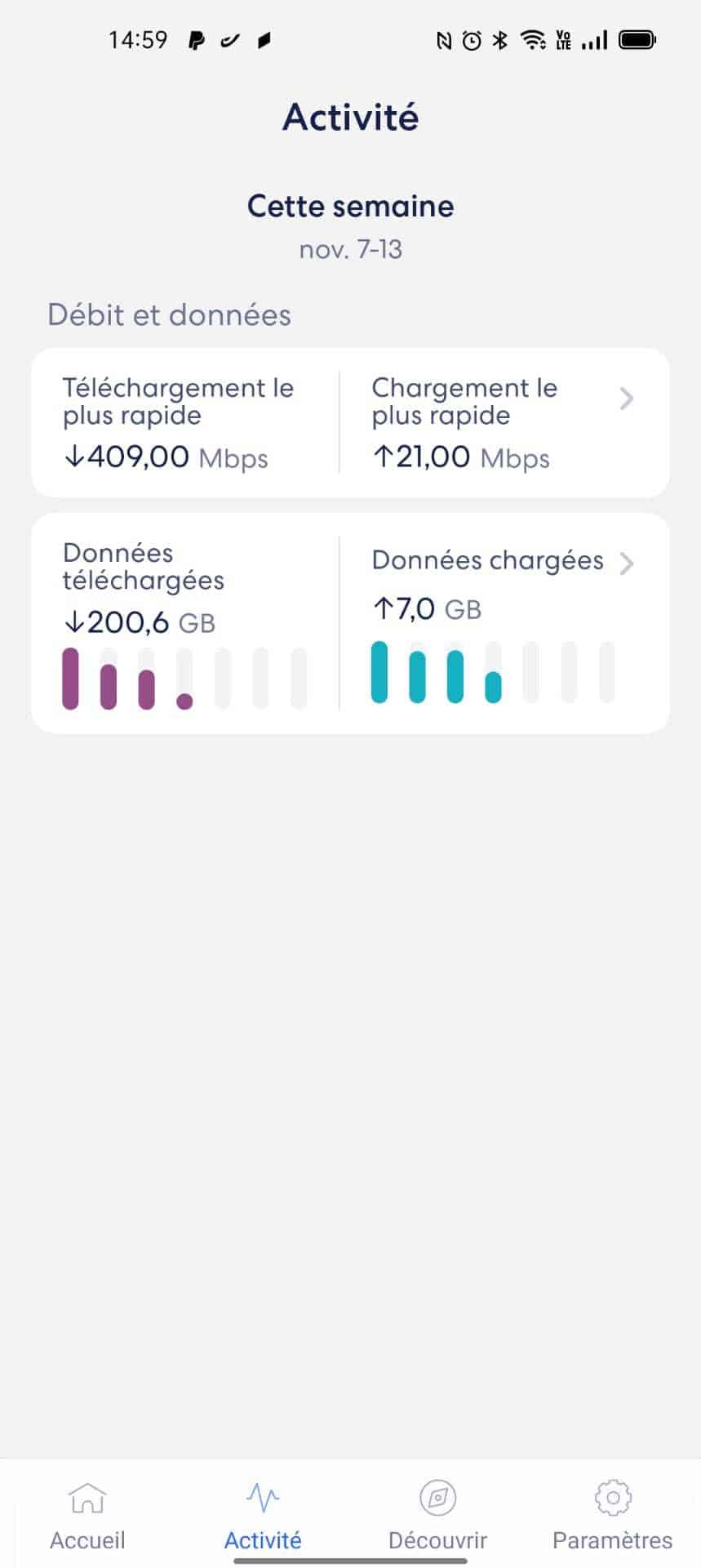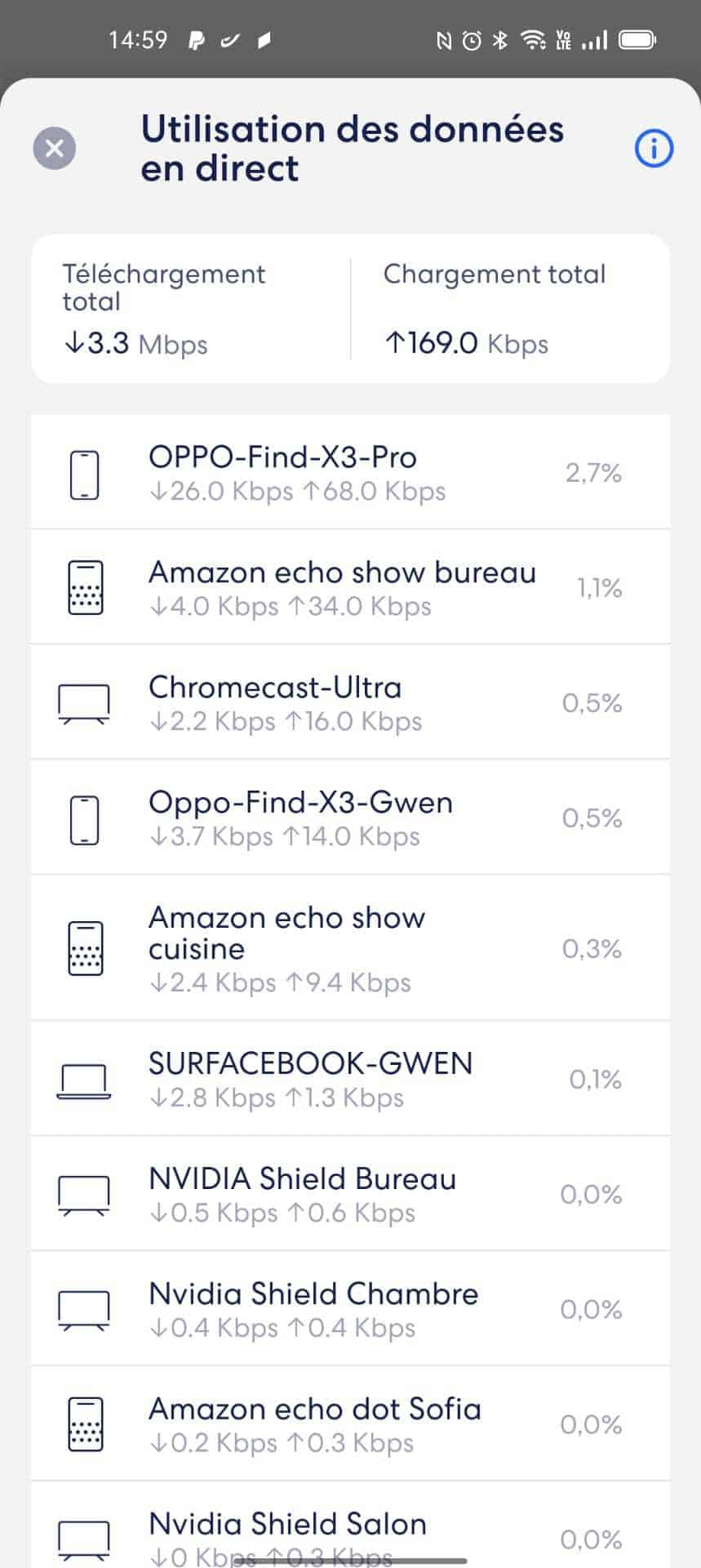 Sur le boîtier principal (base), nous avons mesuré en moyenne un débit de 405 Mb/s en nous plaçant à proximité de l’appareil. En se déplaçant un peu plus loin, dans une autre pièce le débit baisse logiquement. Nous avons mesuré entre 350 et 380 Mb/s à une dizaine de mètres, ce qui reste largement suffisant pour une utilisation multimédia classique. Sur les boîtiers satellites, les mesures effectuées restent autour de 370 Mb/s. Il est logique d’avoir une légère baisse de performances entre la base qui est proche du routeur principal (dans notre cas une Box Internet).