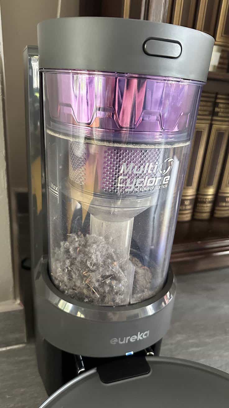 Il est assez surprenant de retrouver, après seulement deux passages, tant de poussière dans le réservoir de l’Eureka E10S, alors même que le Dreame L20 Ultra est déjà passé par là. Ce dernier, qui je le rappelle ne joue pas dans la même catégorie, dispose d’une puissance de 7000 Pa. Pourtant, l’Eureka E10S arrive à récupérer une bonne quantité de poussière qui n’avaient visiblement pas été récupérés par le Dreame.