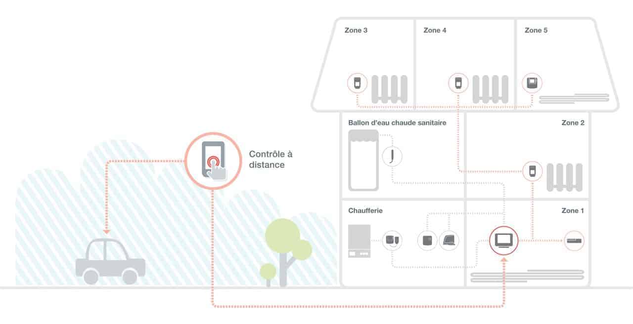 - Le transmetteur qui se raccorde à votre chaudière (avec deux fils en on/off ou via une interface spécifique pour les chaudières élaborées)
