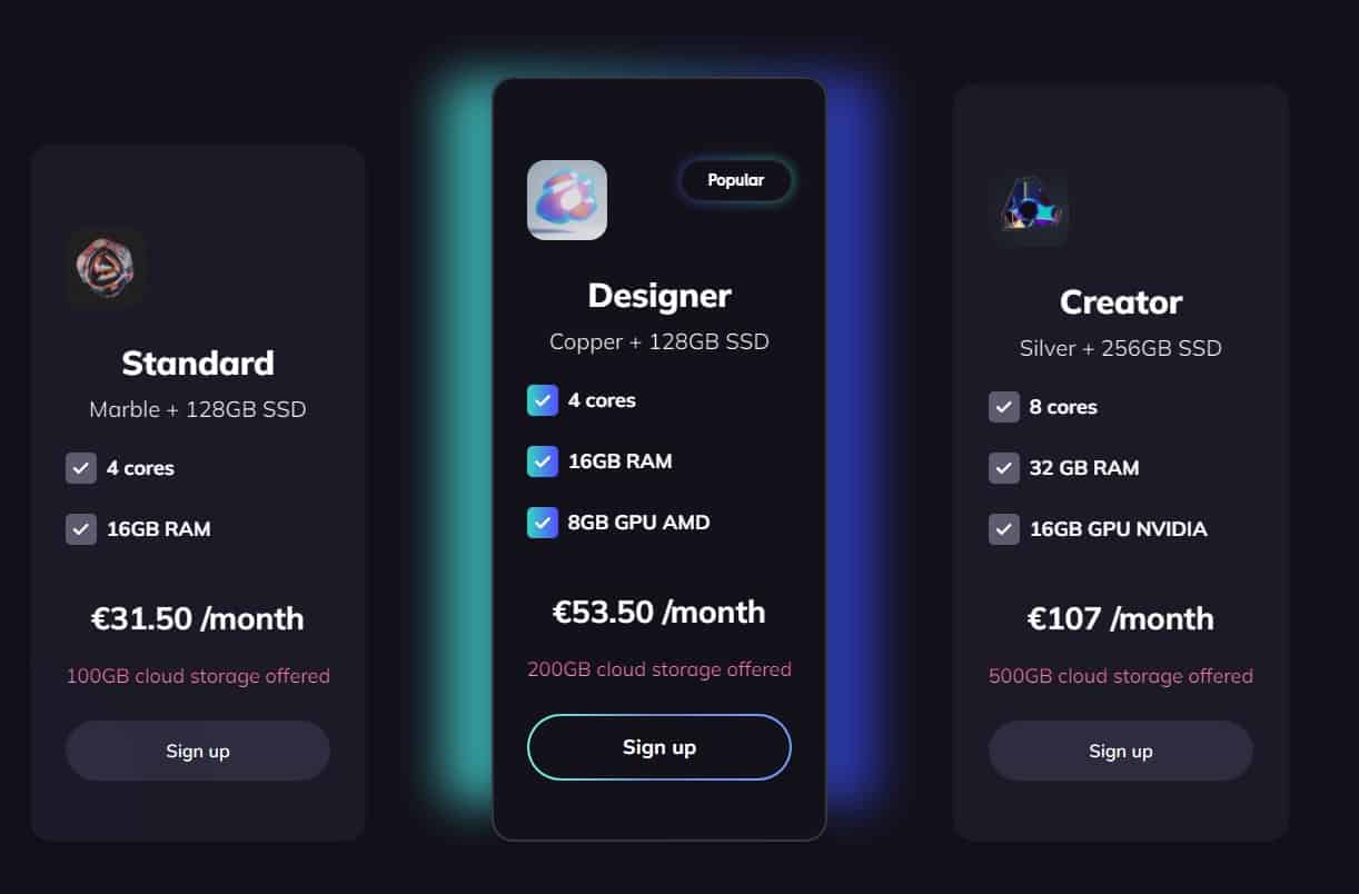 Le prix fluctue en fonction de la puissance que vous prenez et de la carte graphique : vous pouvez bénéficier d’un maximum de 256 processeurs, de 4 cartes graphiques (Nvidia Tesla 4 ou Radeon Pro V520) et 16 To de stockage sur votre machine.