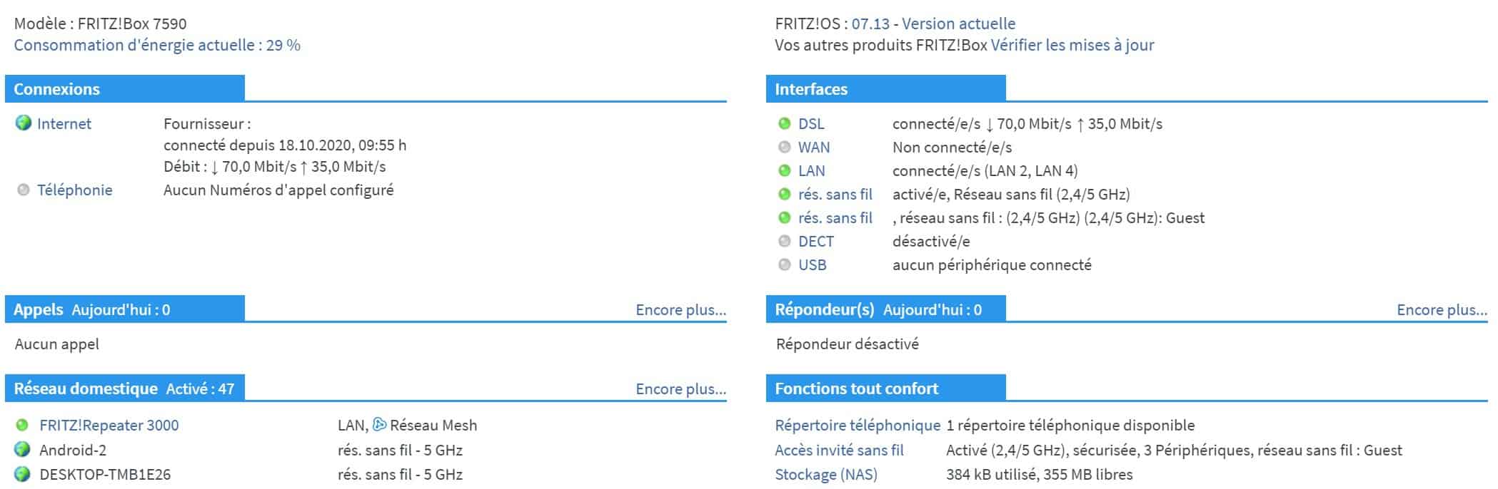 Une fois l’installation du routeur FRITZ!Box 7590 et du répéteur WiFi FRITZ!Repeater 3000, l’application FRITZ!OS vous donnera un aperçu complet de votre réseau.