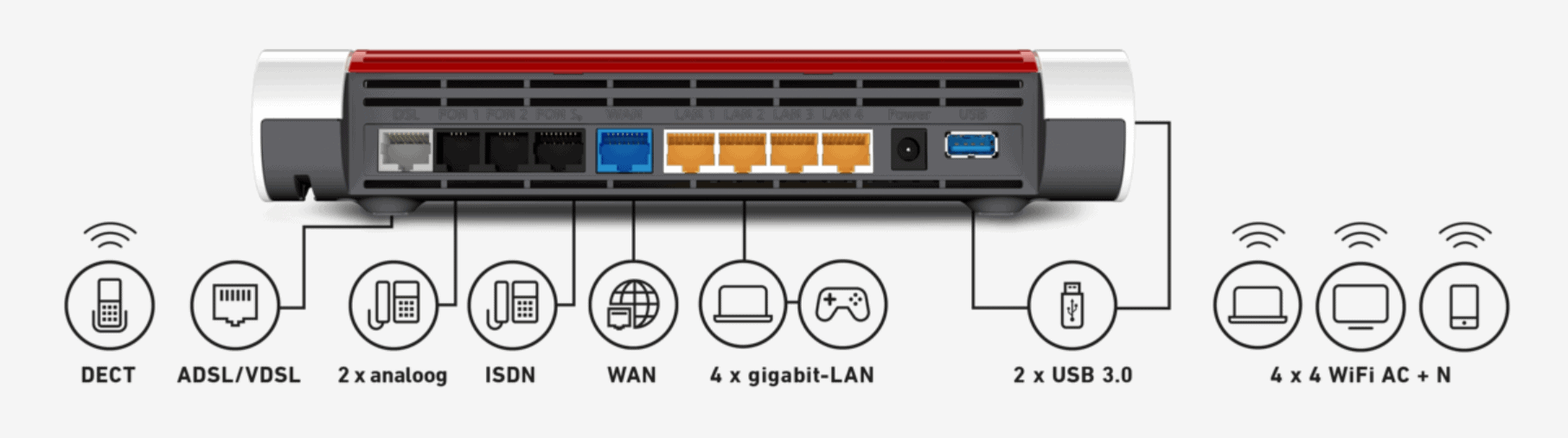 Un WiFi haut de gamme, un LAN Gigabit ultra rapide ainsi que des ports USB 3.0 performants rendent le réseau à grande vitesse parfait. Un autocommutateur complet avec répondeur et fonction fax fait aussi partie de l’équipement.