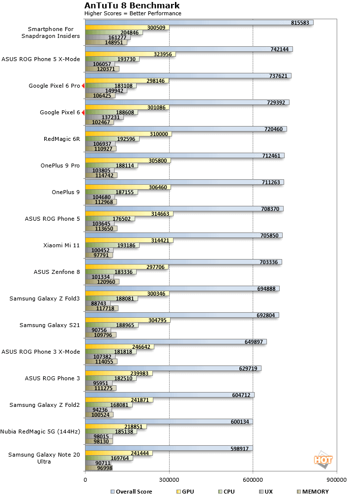 Google inaugure avec ses smartphones Pixel 6 son tout nouveau SoC sobrement nommé Google Tensor et pour une première puce maison, c’est plutôt concluant. Il s’agit d’un processeur à 8 cœurs doté d’un GPU Mali-G78 à 20 cœurs. C’est une puce tout terrain qui prend en charge les tâches les plus exigeantes et qui s’adapte rapidement en fonction de l’utilisation pour optimiser la consommation. En matière de performances brutes, on peut la rapprocher des processeurs Snapdragon 888 ou Exynos 2100. En parallèle, on retrouve 8 Go de mémoire vive et un stockage ultra rapide UFS 3.1 de 128 Go (non extensible via carte SD). Le tout propose une fluidité de tous les instants, en multitâche comme dans le jeu.