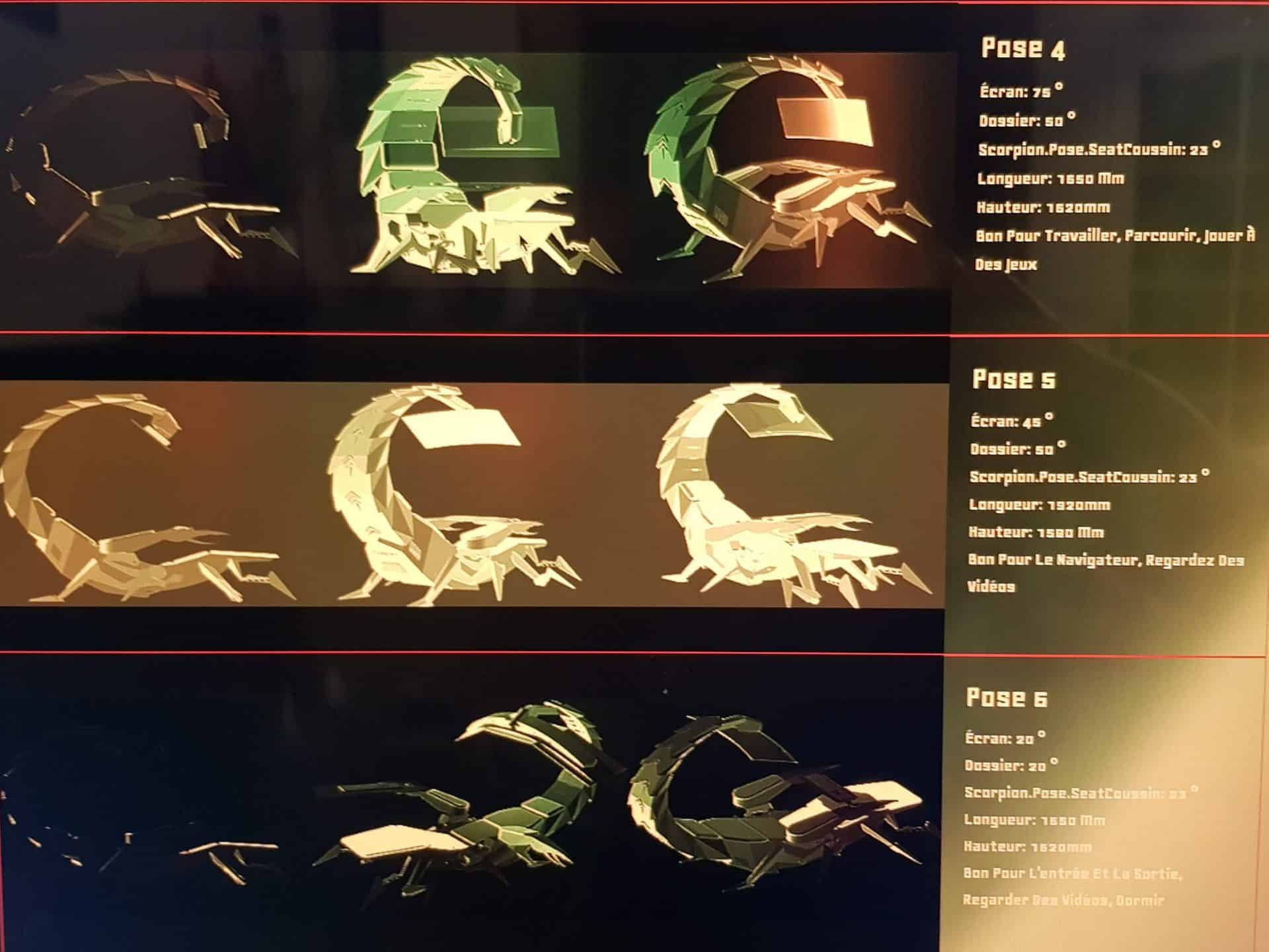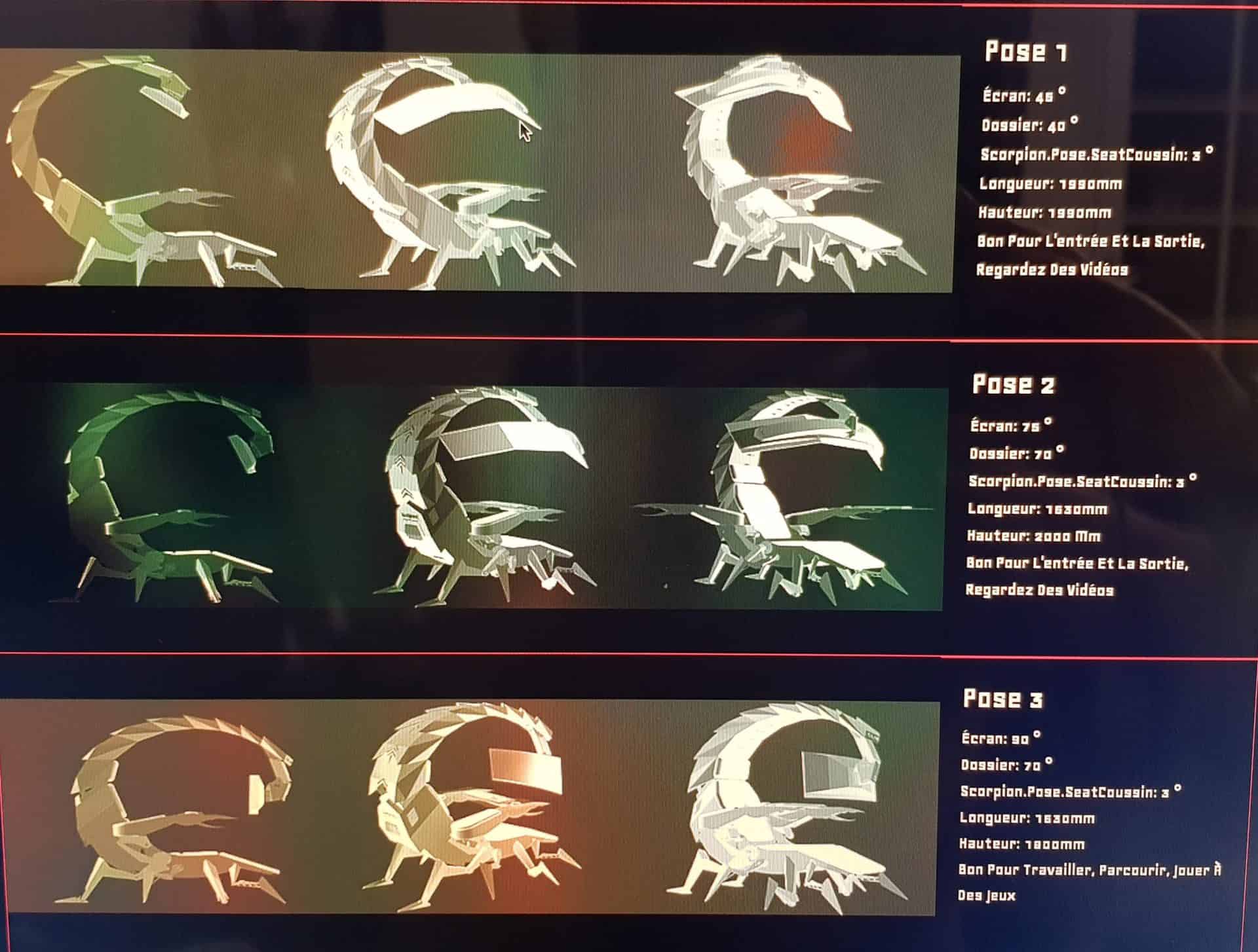 Chaque aspect de la plate-forme, du support de moniteur réglable aux accoudoirs en passant par ses huit pieds, a été conçu dans un objectif d’ergonomie suprême. Se convertissant en six poses différentes, le siège mécanique reproduit les positions des scorpions pour fournir aux utilisateurs des orientations dynamiques pour maximiser les performances.