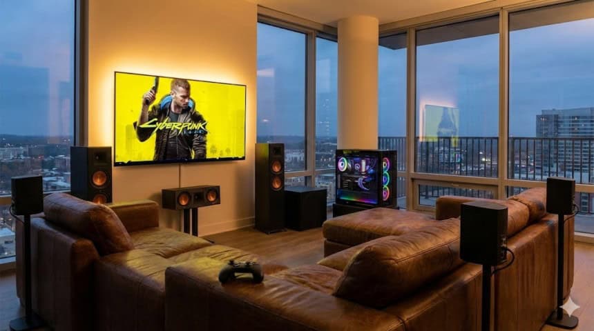 Dans les jeux : C’est là que la claque arrive. Sur un titre compatible, la localisation des ennemis est chirurgicale. On entend les pas derrière soi, les tirs qui sifflent au-dessus. Le HT-A9 utilise la réflexion sur le plafond, et avec la source Atmos native du PC, l’effet bulle est total. On ne joue plus devant un écran, on est dans le jeu.