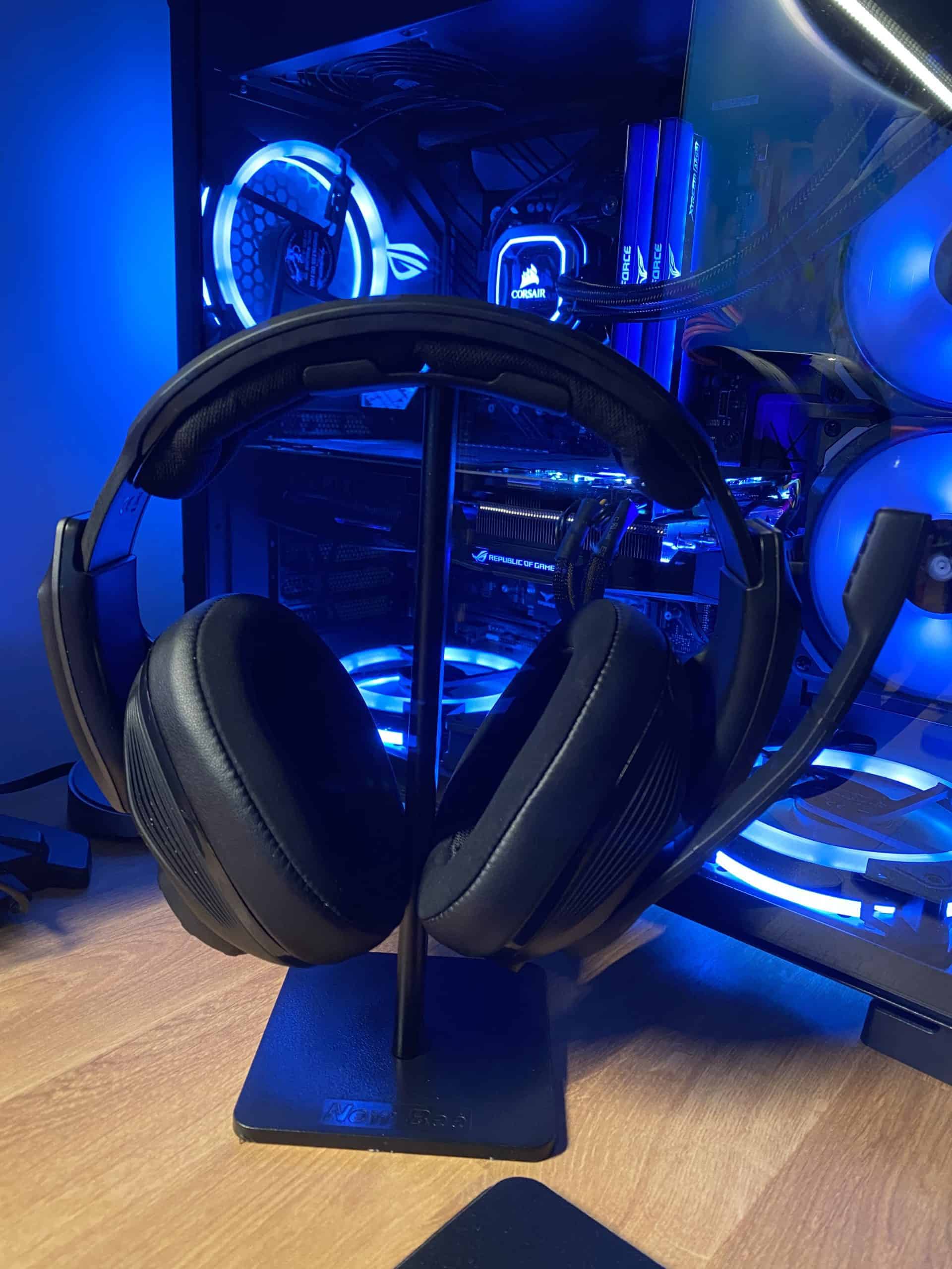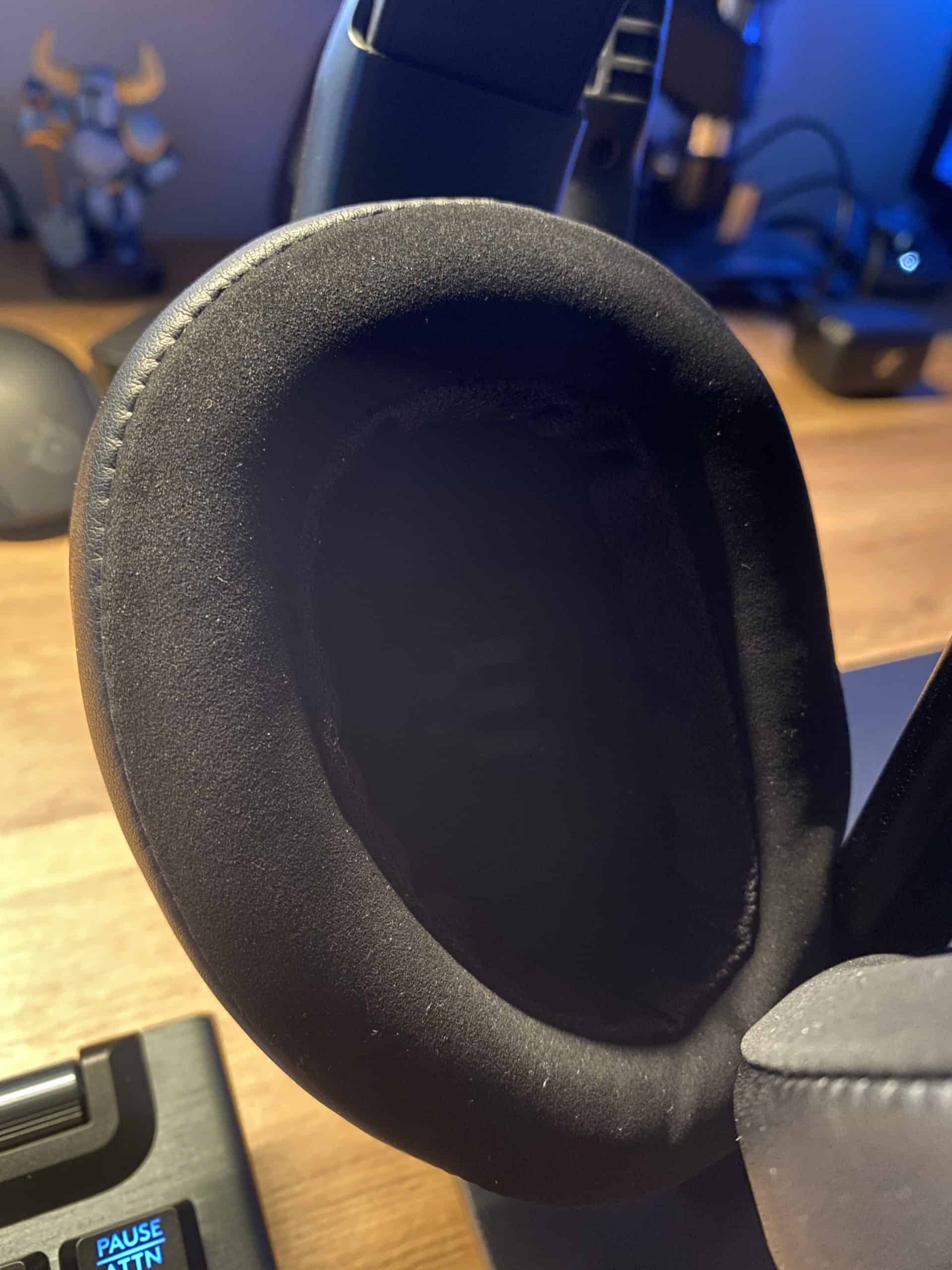 On ne va pas se le cacher, le look général lui donne un côté massif. Mais ça lui confère du coup un aspect robuste. Et pour un casque à 349 €, on espère quand même un truc qui tienne la route et qui résiste à quelques malencontreuses chutes dues à des ragequits inopinés. Bref, j’ai été surpris au premier déballage. Et si après ça, on remarque son poids de 398 grammes, on aurait presque envie de partir en courant. Mais une fois installé sur sa tête, il en est autrement. Le poids est très bien réparti, il est agréable, se règle au millimètre et son imposante ossature se fait oublier comme par magie. Les oreillettes en simili englobent à merveille vos oreilles et vous isolent parfaitement de ce qui vous entoure. C’est la réduction passive de bruit. Et ça fonctionne bien.