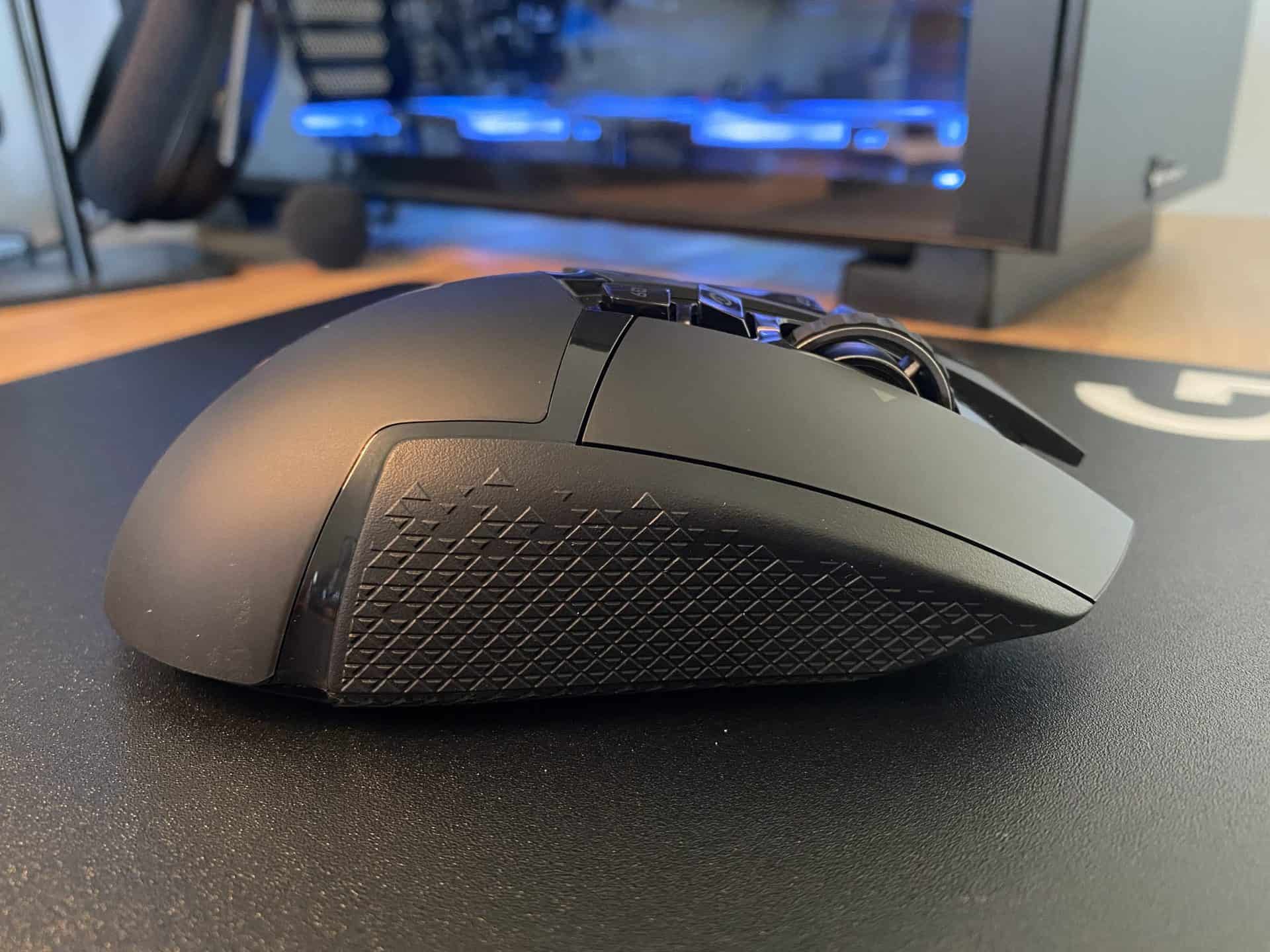 Et grosse nouveauté pour ma part : 2 boutons très bien placés sur la droite du clic gauche. Un régal. La Logitech G502 Lightspeed offre donc 7 boutons supplémentaires à la portée de vos doigts (3 pour le pouce, 2 pour l’index et la molette cliquable gauche/droite). Un autre près de la molette la rendra crantée ou exempte de tout crantage pour un défilement souple et harmonieux. À vous de choisir en fonction de l’utilisation du moment. Et pour terminer : le revêtement des faces latérales est très agréable puisqu’il est structuré par de petits triangles en relief qui empêchent vos doigts de glisser. Et qui donnent aussi un look à votre souris.