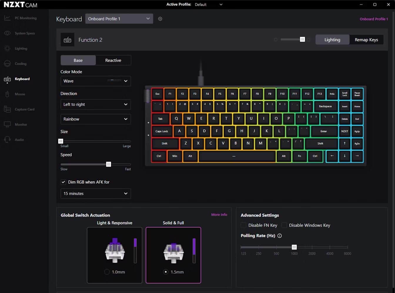 En ce qui concerne la partie software, le clavier est compatible avec le logiciel CAM qui est assez classique, mais pas pour autant inutile. Signalons d’abord que le NZXT Function est équipé d’une mémoire intégrée capable d’enregistrer jusqu’à 4 profils. L’idée étant de pouvoir modifier la force d’activation des touches avec CAM, de les sauvegarder et de changer de profil à la volée afin de jongler entre différentes configs pour jouer à Fortnite, Valorant ou CS Go. Enfin, signalons que le logiciel permet également de remapper les touches et de modifier l’éclairage RGB du clavier. En résumé, je dirais que CAM est assez complet et plutôt simple à utiliser.