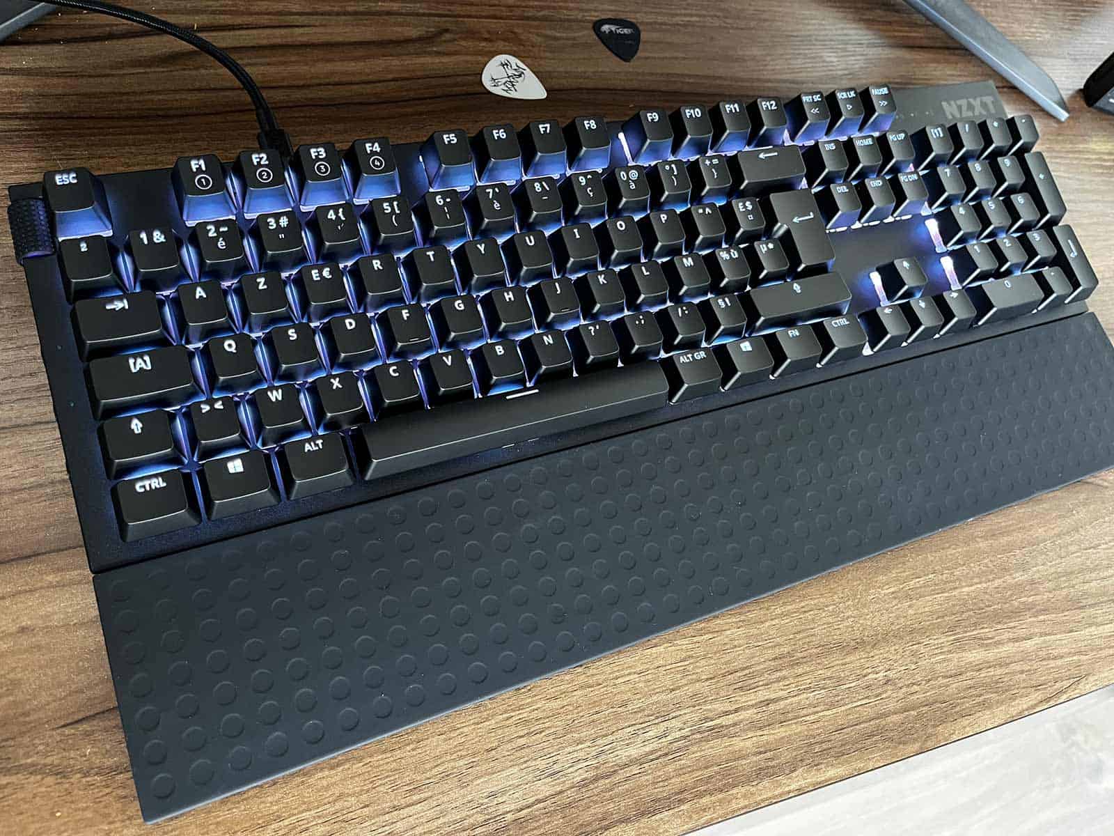Le NZXT Function est donc muni d’un châssis en aluminium de très belle facture qui saura plaire aux utilisateurs en quête d’élégance et de minimalisme. Le tout est également muni d’une couche de mousse insonorisante afin d’éviter les bruits indésirables qui caractérisent les claviers mécaniques et l’on retrouve également un repose-poignets qui est assez bienvenu, même si j’aurais apprécié qu’il soit rembourré. Ceci dit, vous comprendrez qu’il n’y a pas vraiment de quoi se plaindre lorsque l’on abordera la question du prix. Le Function est également livré avec une pince et un extracteur de touche afin de faciliter la personnalisation.