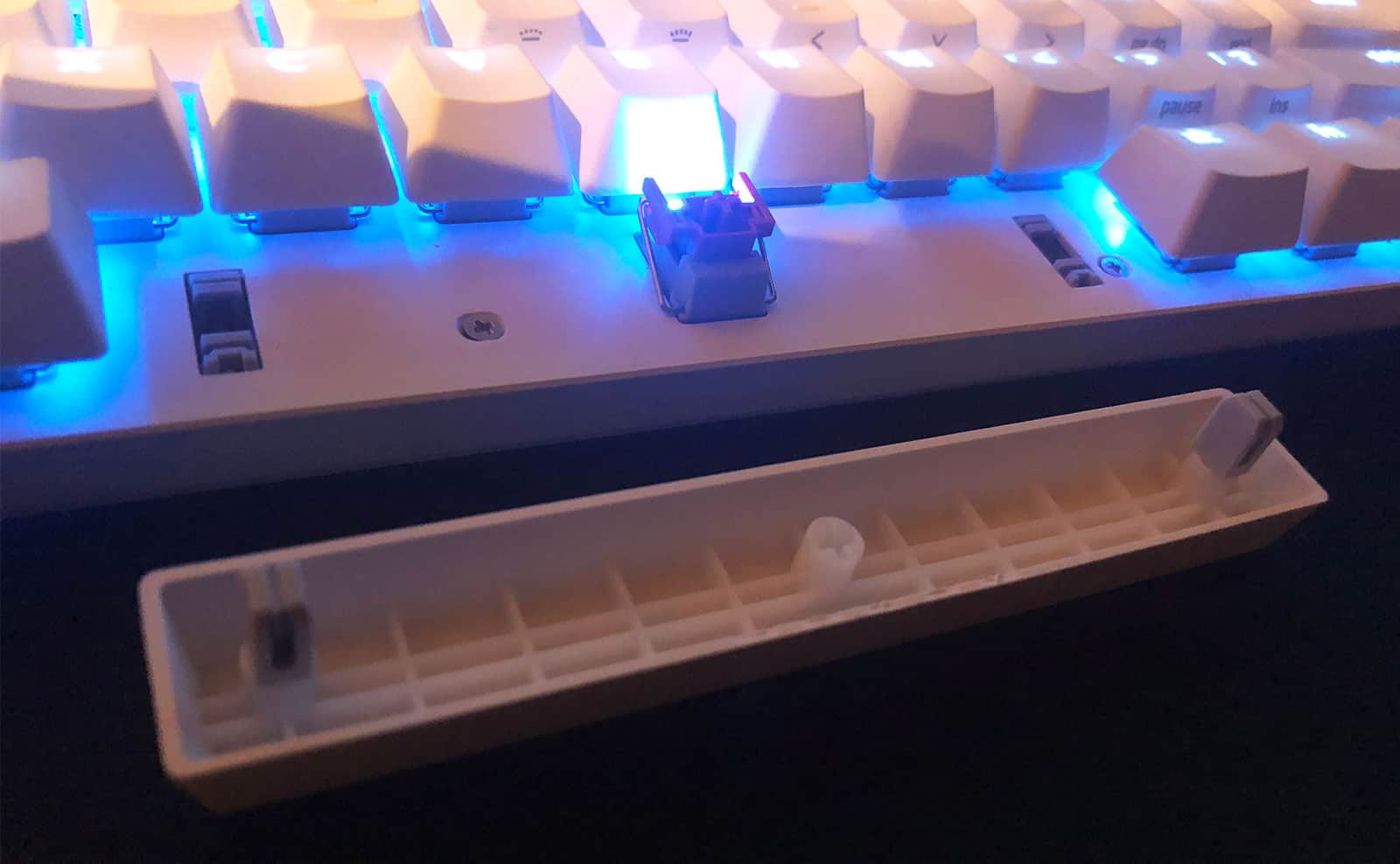 Parlons à présent des keycaps et plus particulièrement de celles des grandes touches. Si on s’attarde par exemple sur la barre d’espace, on remarquera que les stabilisateurs y sont directement fixés. Ce qui est assez étonnant puisqu’ils sont généralement fixés au châssis. Cependant, on se rendra rapidement compte à l’usage que c’est plutôt astucieux puisque même quand on appuie sur le bord d’une grande touche, le contact se fait très bien. Comprenez qu’il n’y a pas de “wobbling” comme disent les amateurs de claviers mécaniques.