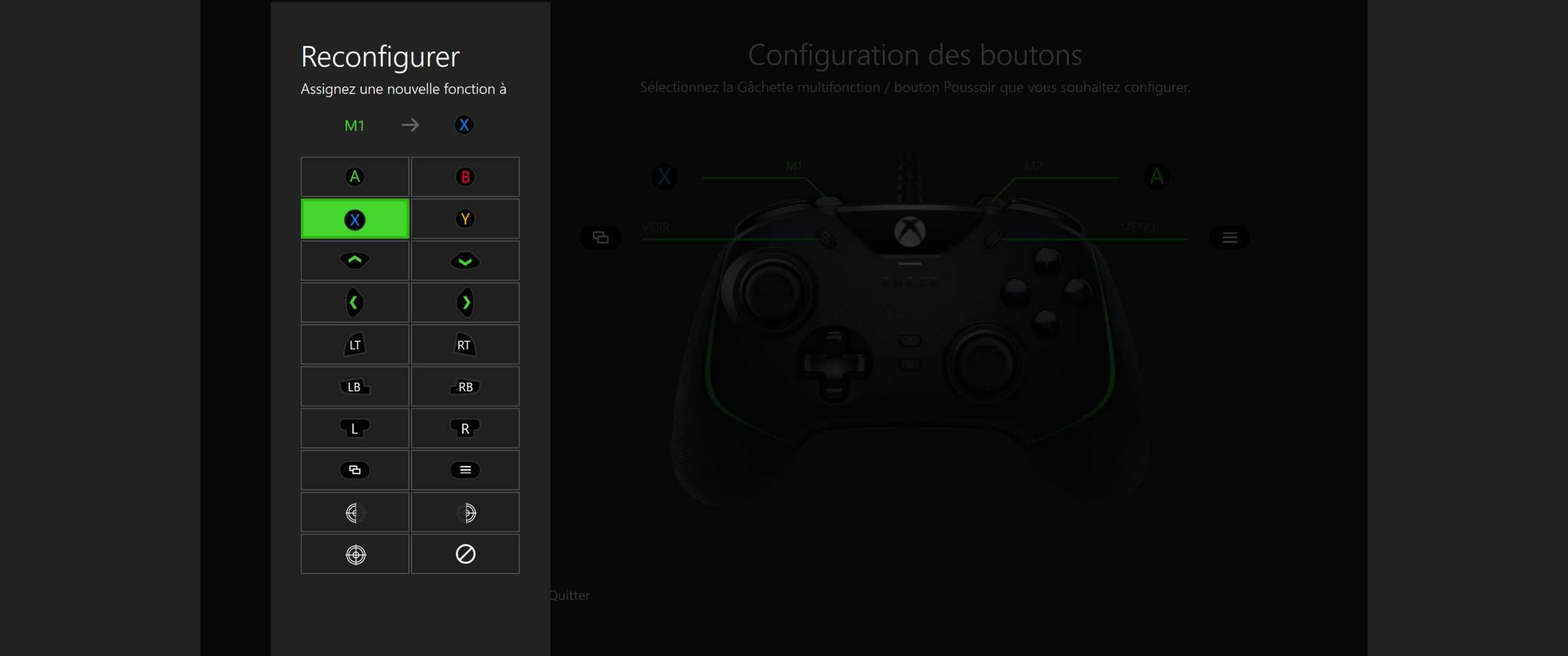 Sur la tranche supérieure de cette Razer Wolverine V2, on retrouve 2 boutons supplémentaires. Tout simplement appelés M1 et M2. Via l’app Xbox ou PC « Razer Controller Setup », vous pourrez leur réattribuer une nouvelle fonction parmi une liste de 19 possibilités. Etant donné qu’ils tombent tout naturellement sous les index, il est agréable de pouvoir disposer de « raccourcis » aussi facilement.