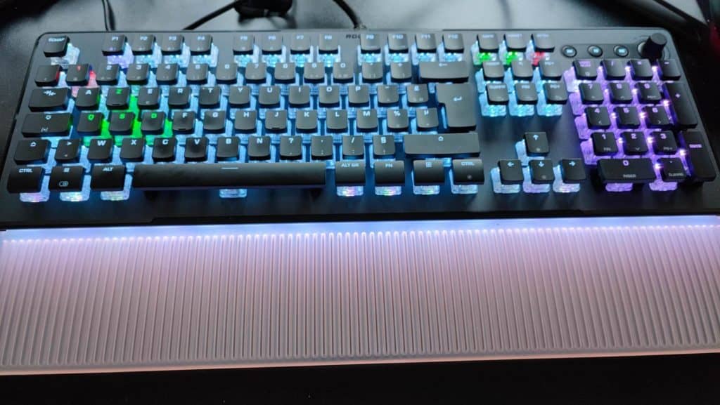 Au niveau des différences, qui dit version max dit toutes les touches y compris les touches fonction, les touches multimédia et le pavé numérique. On note également l’apparition d’un repose poignet translucide permettant de prolonger l’éclairage RGB encore plus loin pour un effet magnifique.