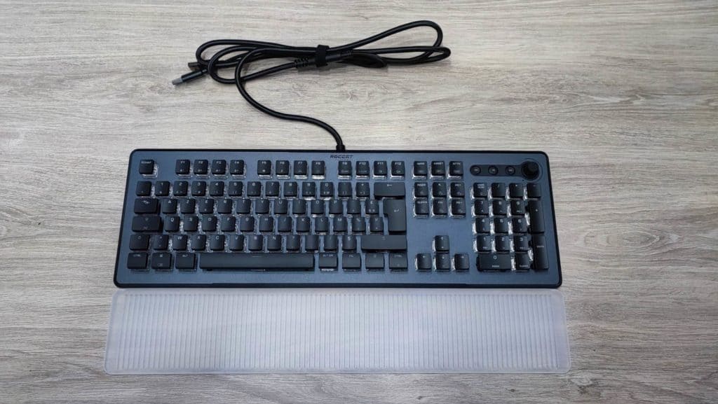 Avant d’aborder les différences, commençons par les points communs entre le Roccat Vulcan II MAX et le Roccat Vulcan II mini. La version max est toujours équipée des switchs optiques-mécaniques Titan II linéaires. Outre leur durée de vie de 100 millions de clics, la vitesse de réaction est impressionnante et la frappe est fluide alors qu’au début je n’étais pas vraiment convaincu. De plus, le Roccat Vulcan II MAX est également doté de la technologie Easy-Shift[+]. Cette dernière permet, lorsque le mode jeu est activé, de débloquer des nouvelles fonctions spécifiques comme changer rapidement de profil ou voir l’état de la batterie de la souris en appuyant sur le caps lock et la touche ad hoc.