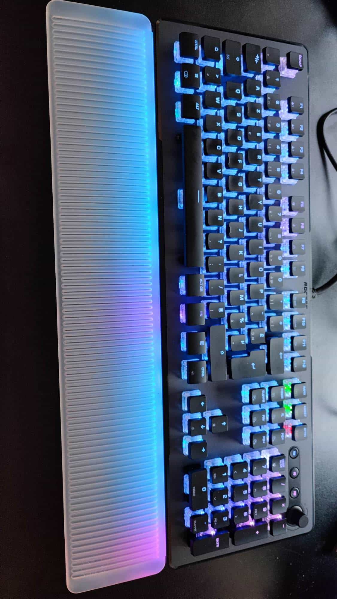 Au niveau des différences, qui dit version max dit toutes les touches y compris les touches fonction, les touches multimédia et le pavé numérique. On note également l’apparition d’un repose poignet translucide permettant de prolonger l’éclairage RGB encore plus loin pour un effet magnifique.