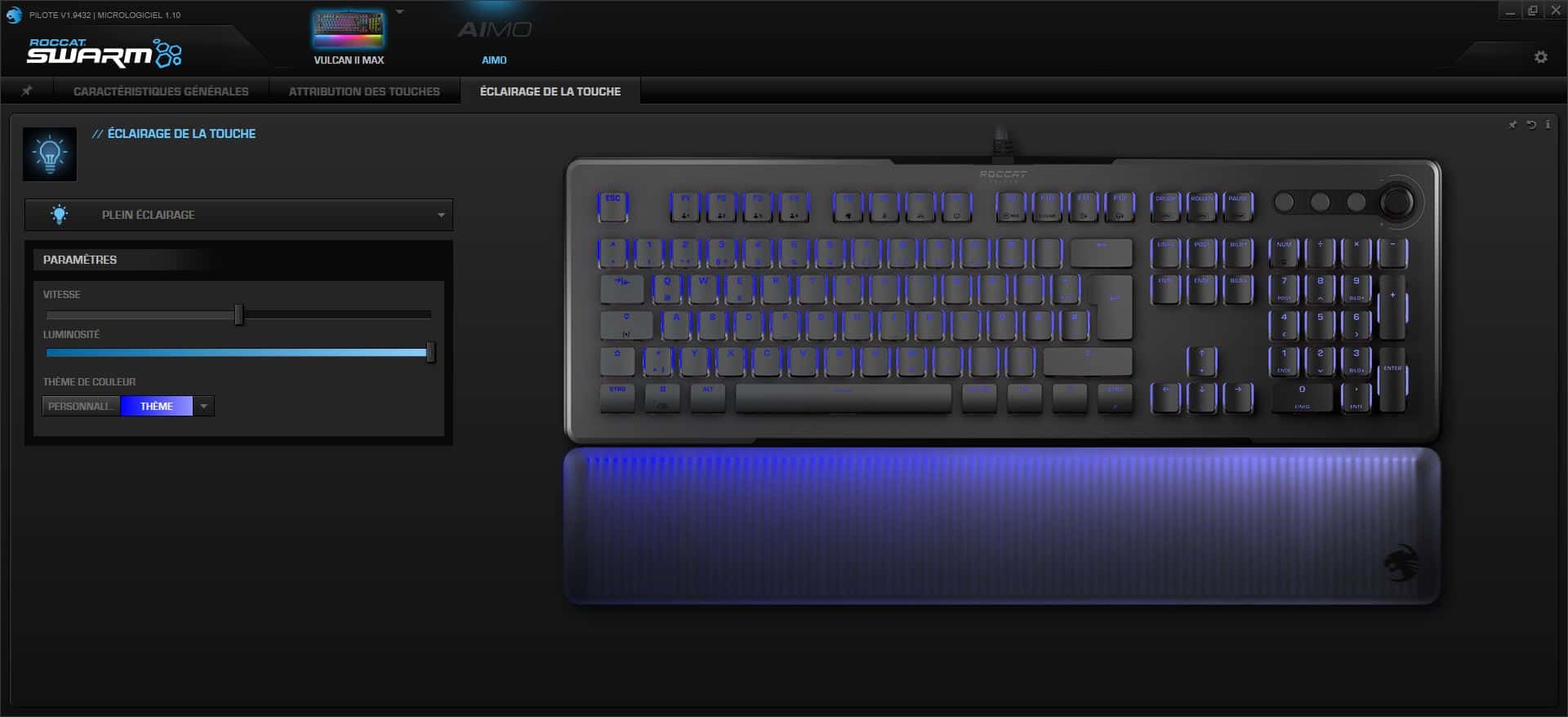 Enfin, le clavier Roccat Vulcan II MAX embarque également du dual LED RGB et la technologie AIMO qui permet d’harmoniser les couleurs sur tous vos périphériques Roccat. Dernier détail et non des moindres, le clavier est toujours doté d’une plaque d’aluminium anodisé qui rend l’ensemble ultra robuste.