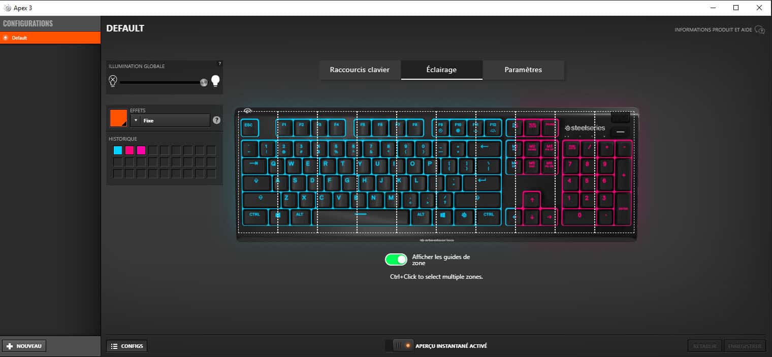 - Grâce à l’app SteelSeries Engine 3, il est possible de personnaliser 10 zones différentes avec des couleurs RGB