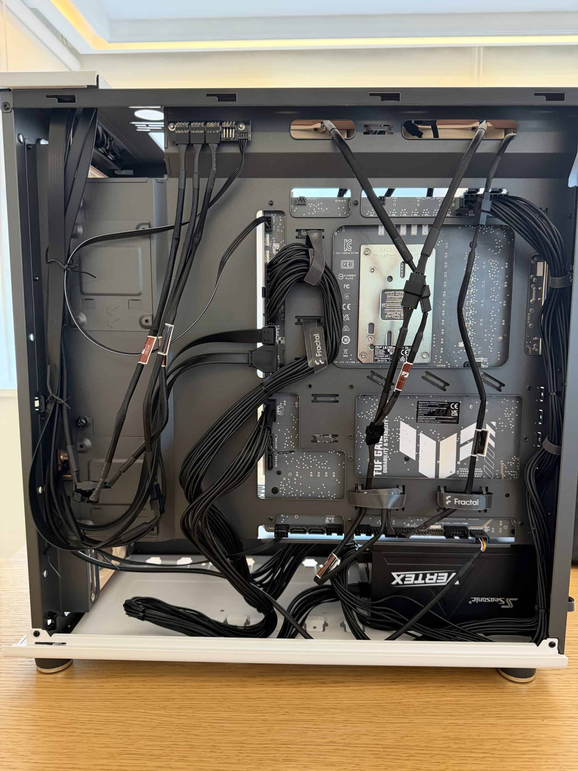 D’habitude, on s’écorche les doigts pour aller brancher le petit connecteur CPU en haut à gauche du boîtier, coincé entre le radiateur du watercooling et le ventilateur arrière. Ici ? Rien de tout ça. On a tourné le boîtier, et tout branché confortablement à l’arrière. C’est un confort de montage que je n’avais jamais expérimenté.