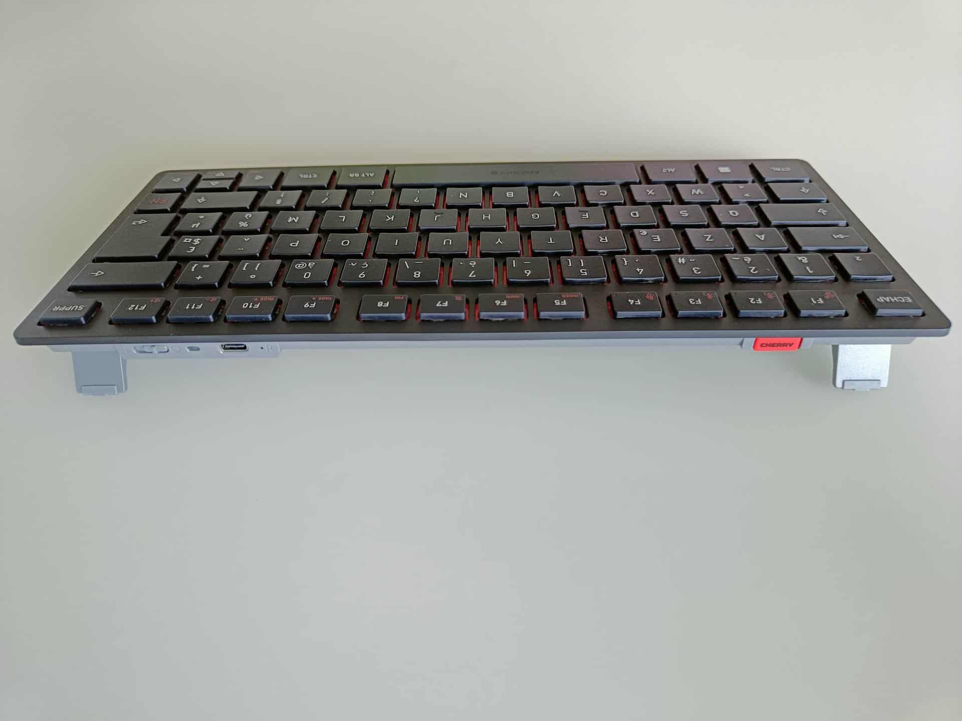 Dès la prise en mains, le clavier fait honneur à la réputation de la marque. Il a beau afficher des mensurations compactes, 29,5 cm x 13 cm, il pèse tout de même 432g, grâce à une plaque métallique massive dans le clavier. L’impression de robustesse qui en résulte contraste terriblement avec son petit gabarit. Cela donne un côté qualitatif rassurant à l’objet. Il est évidemment ultra-fin et cela lui confère un look très épuré. La couleur rouge sous les touches apporte de la fantaisie, dans les tons cerisés de Cherry, la boucle est bouclée.