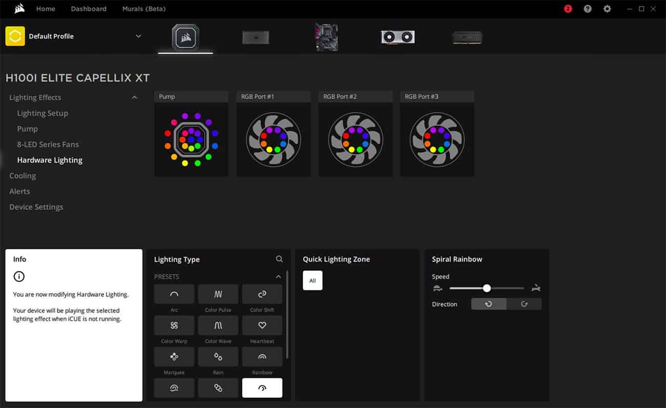 Comme la plupart des produits de la marque, le Corsair H150i Elite Capellix XT est compatible avec iCUE. Grâce à ce logiciel, il est possible de mettre en place des effets d’éclairage RGB dynamiques, mais aussi de les synchroniser avec ses autres produits Corsair pour un résultat de plus en plus bluffant. À noter qu’il n’est désormais plus nécessaire de brancher les ventilateurs de manière séquentielle, qu’iCUE dispose d’une fonction d’autodétection qui identifie le nombre maximum de LED sur les ports de ventilateur, ainsi que sur la pompe et qu’une flopée d’effets est disponible. Mais ce n’est pas tout puisque le soft permet également de contrôler la température de son processeur au degré près, et ce, notamment grâce à des courbes de ventilation automatisées qui ajustent la vitesse des fans en fonction de la température du système, ou bien tout simplement en contrôlant indépendamment la vitesse de chaque ventilateur et de la pompe.