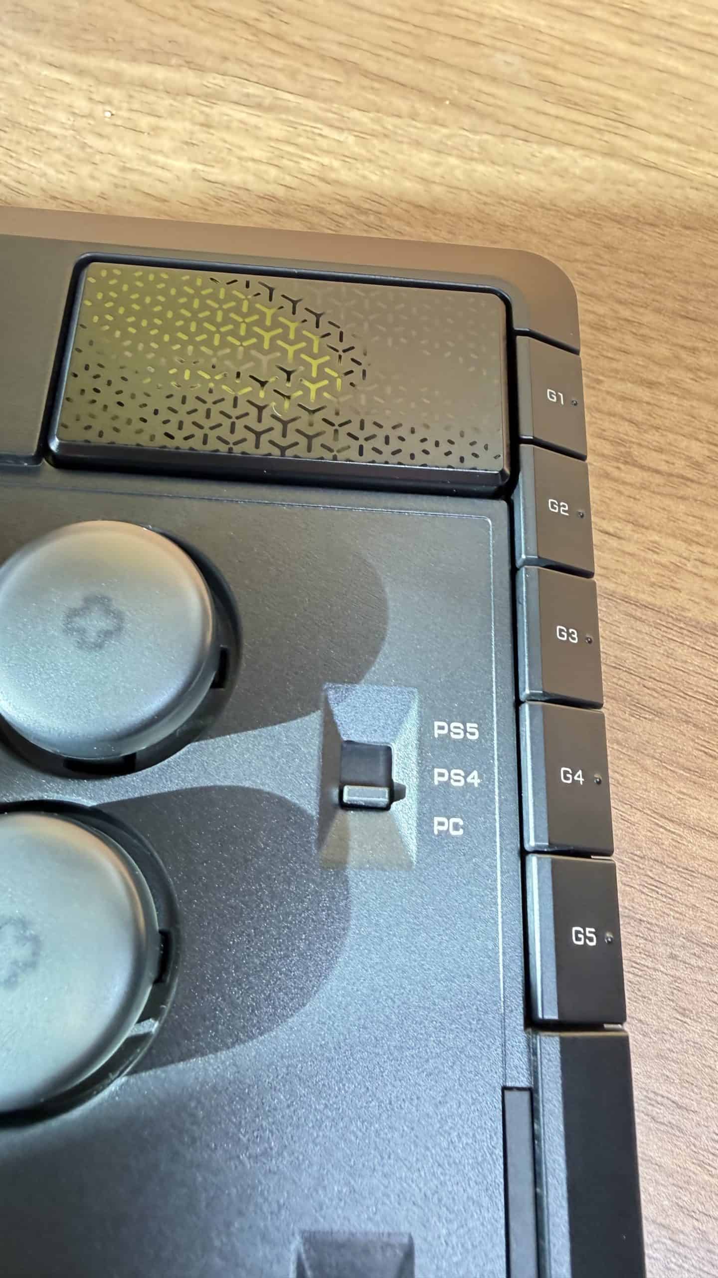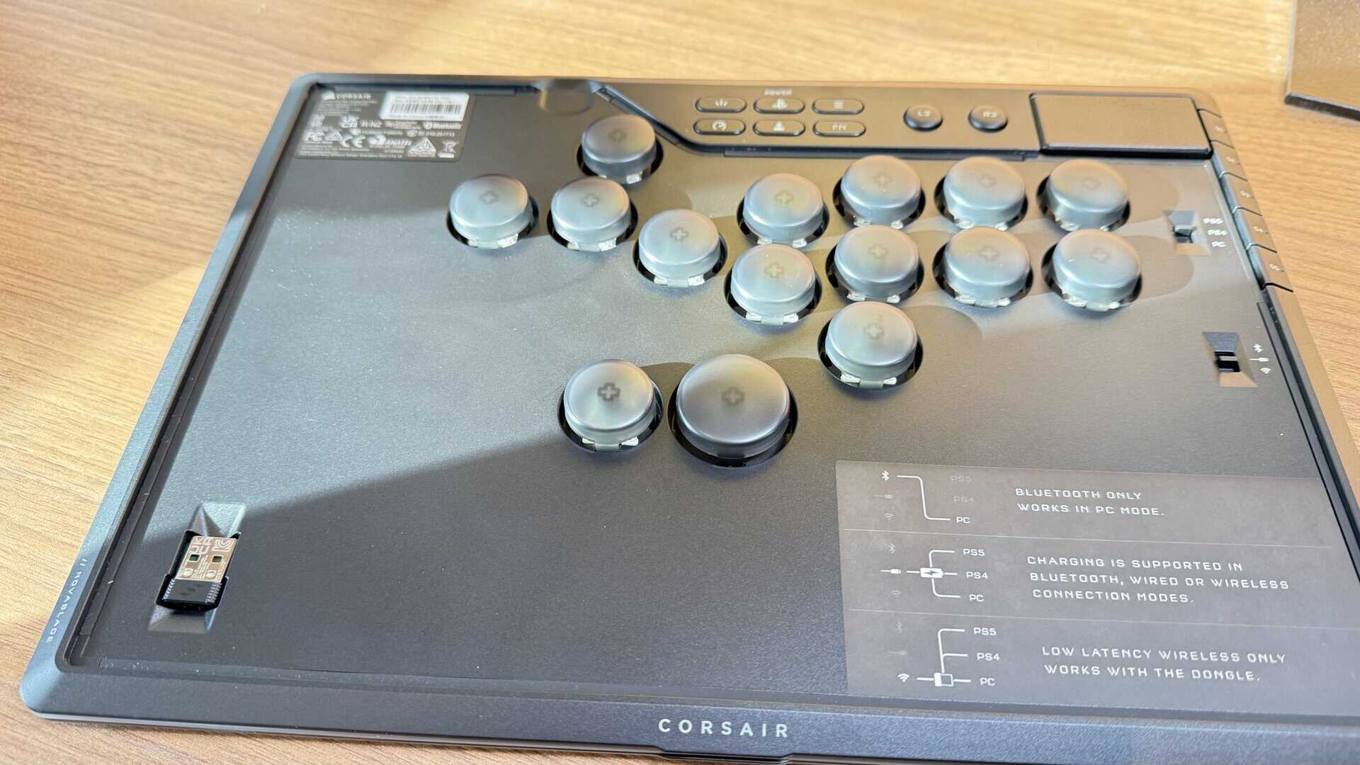 Mais la vraie question était : qu’en est-il du sans-fil ? Jouer à un jeu de combat en Bluetooth est généralement une hérésie à cause de l’input lag. Ici, Corsair utilise sa technologie Slipstream 2.4Ghz.