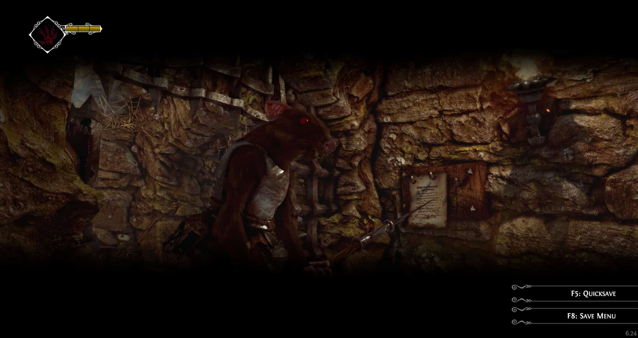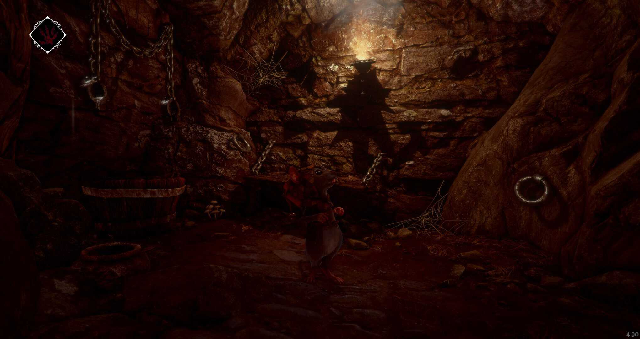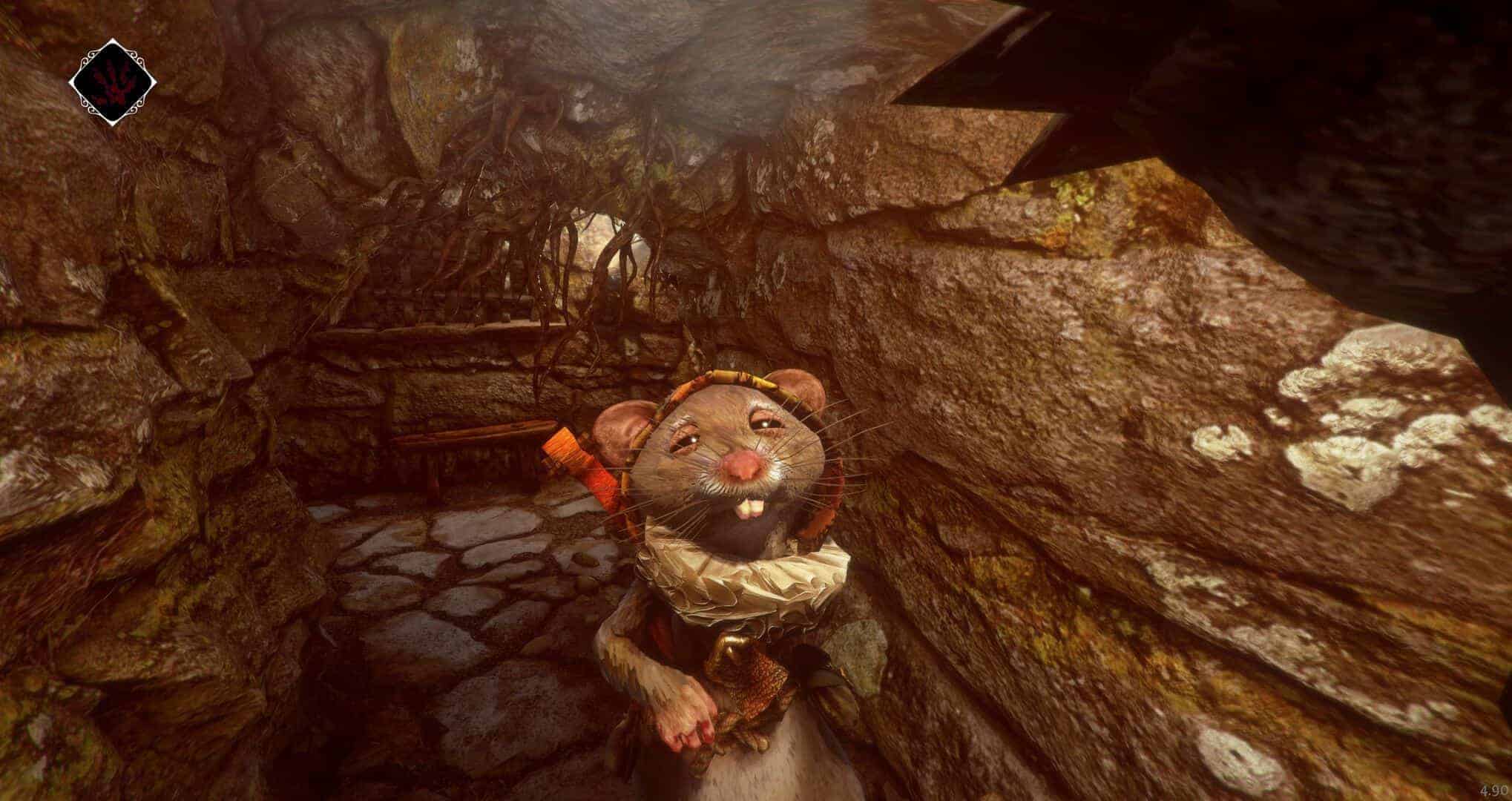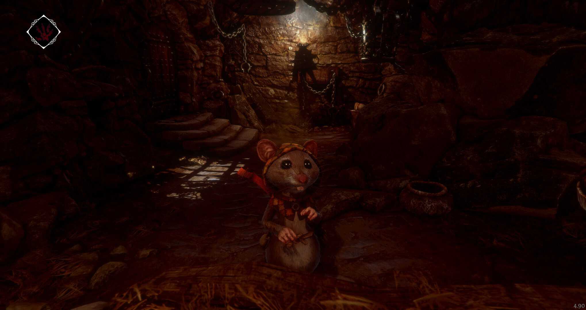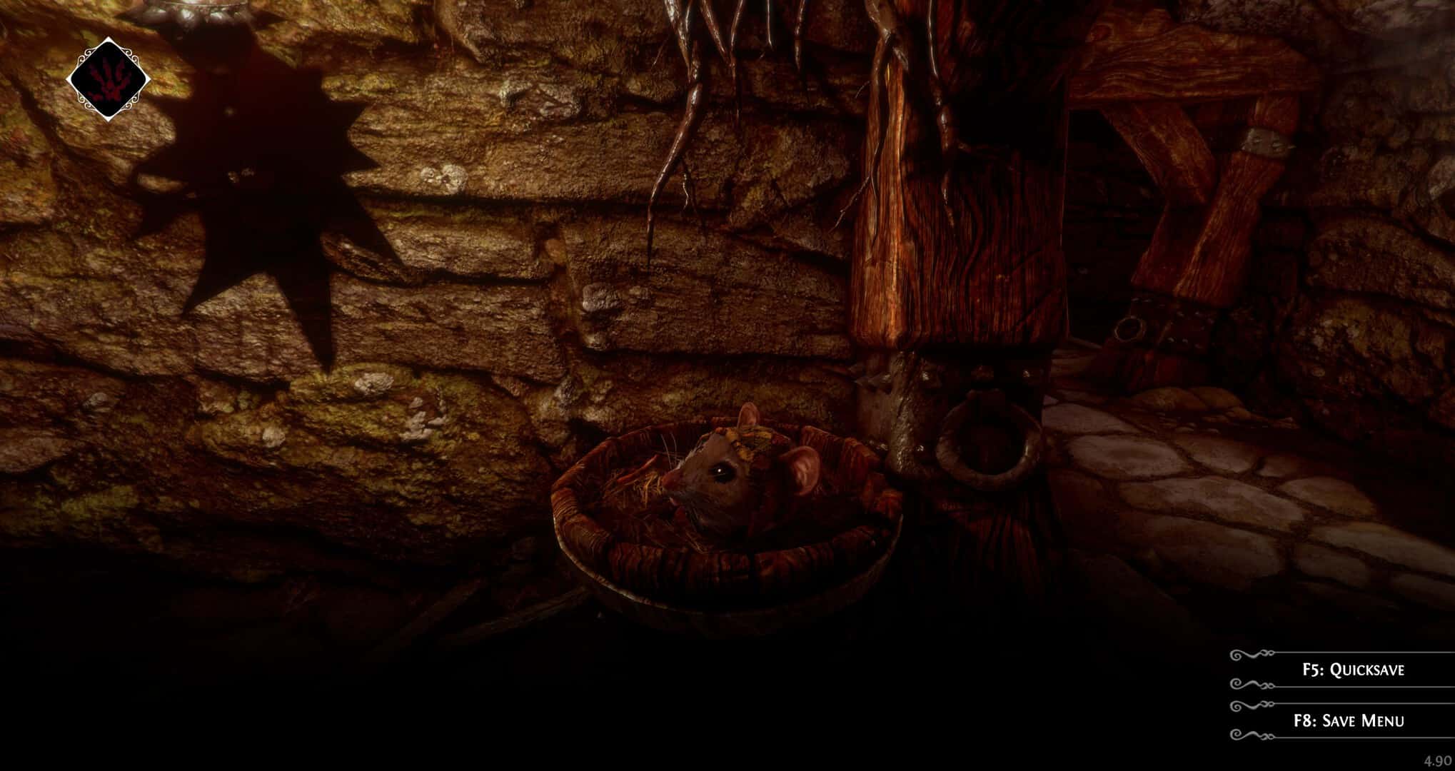 Enfin, quand je dis qu’il n’en faut pas beaucoup plus, c’est une figure de style. Le travail abattu par SeithCG force le respect dès les premières minutes. Mettant à profit tous les outils du moteur Unity, le développeur nous plonge dans un univers médiéval avec une teinte de féerie. À commencer par le fait qu’on incarne Tilo, une “simple” souris, dans un labyrinthe jonché d’énigmes et d’objets à retrouver. Le tout en évitant soigneusement le regard effroyable de rats pas très futés. Le décor est ainsi planté, puisque le jeu repose a fortiori sur un schéma simpliste. On déambule au gré des prisons, bois, cours et châteaux qui ornent Ghost of a Tale. Ensuite, on se cache, on explore et on trouve l’objet qui nous permet de progresser. Très sincèrement, si je m’en étais tenu aux premières minutes, j’aurais abandonné et me serais lassé. D’autant que le jeu ne donne aucune indication quant aux objectifs à remplir.
