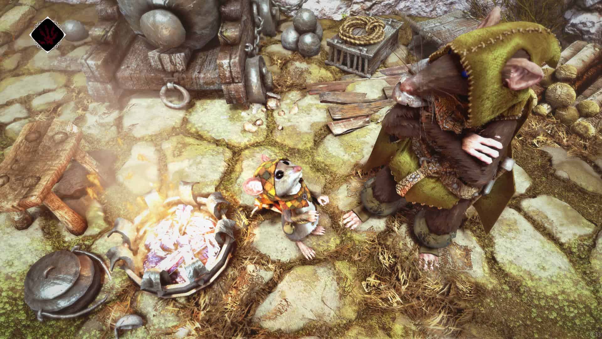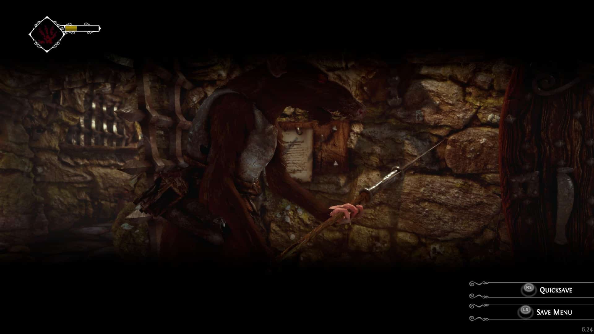 D’ailleurs, rappelons que Tilo est ménestrel de son état. Ce n’est pas un guerrier improvisé qui va manier l’épée du jour au lendemain. Son arsenal se compose d’objets parfaitement anodins, comme des bougies pour se repérer dans le noir (très profond, dans le jeu) ou des bâtons à balancer sur des mécanismes pour les activer. Quelques autres babioles lui permettront de surmonter les épreuves mais globalement, Tilo doit jouer les roublards pour se sortir de sa situation dramatique. Ben oui, les vilains rats ont enlevé son épouse, ce qui va motiver la petite souris à poursuivre l’aventure. D’autres personnages hauts en couleur l’épauleront – moyennant un service, bien évidemment. Tilo devra donc se cacher et courir pour remplir dans la foulée une série d’objectifs secondaires pour retrouver sa tendre et poilue.