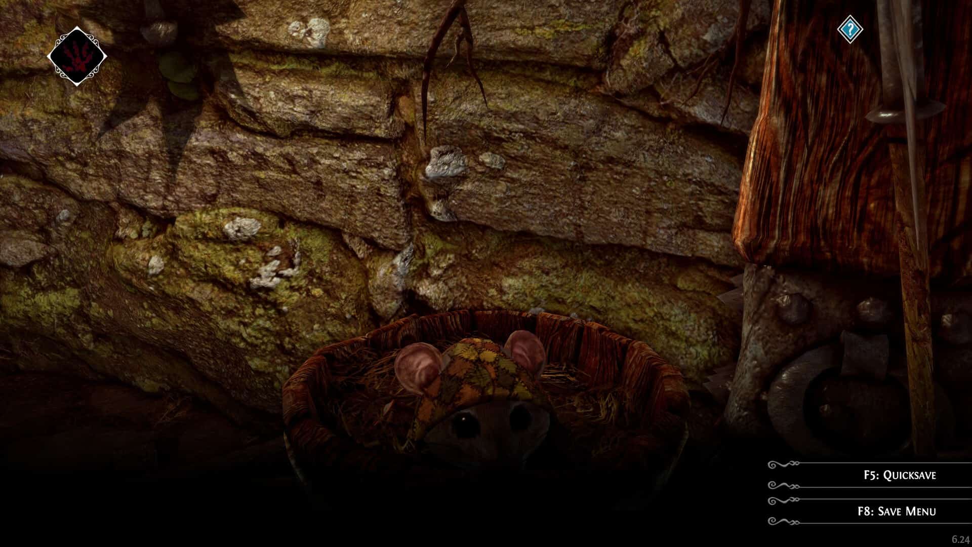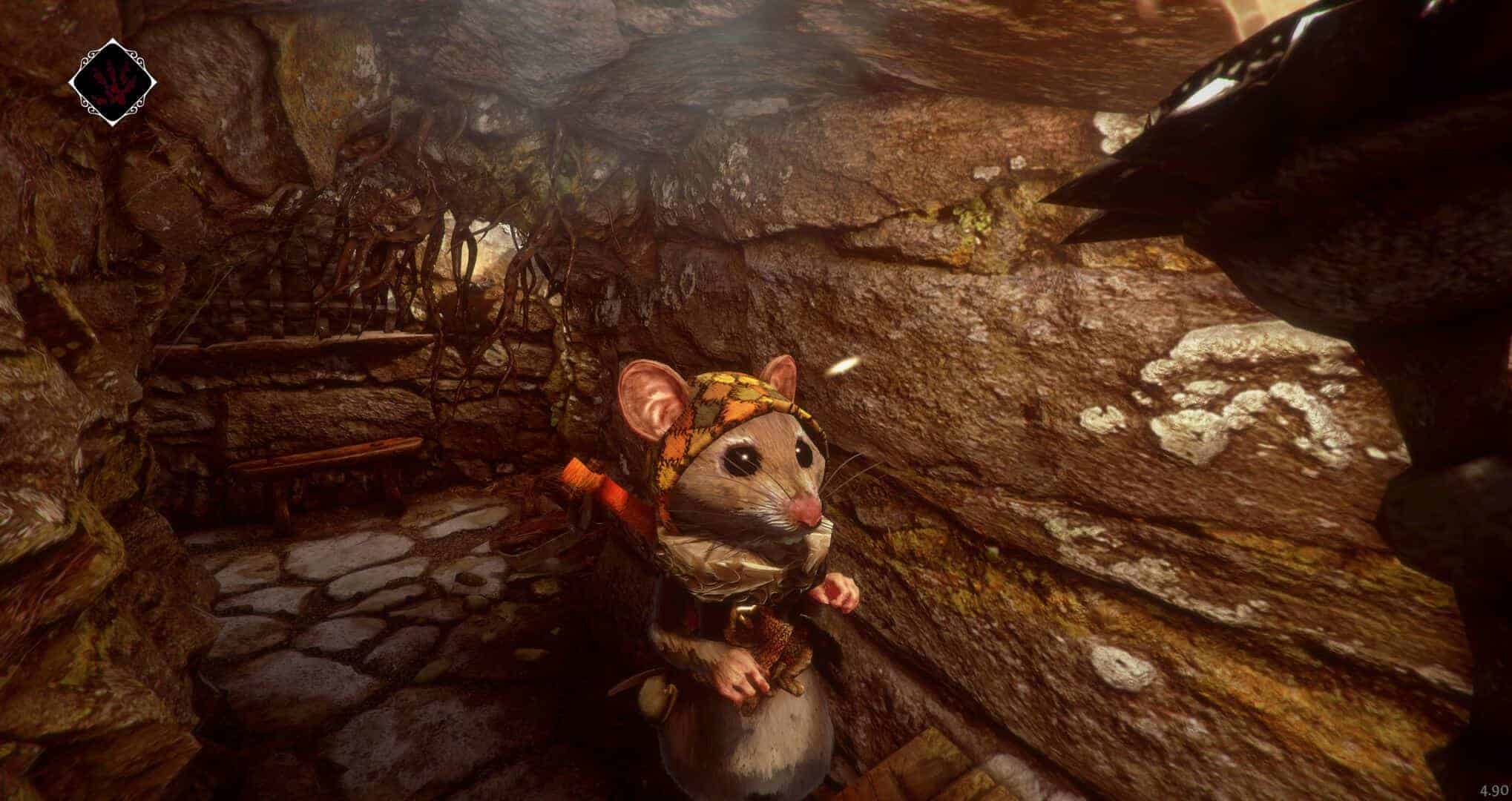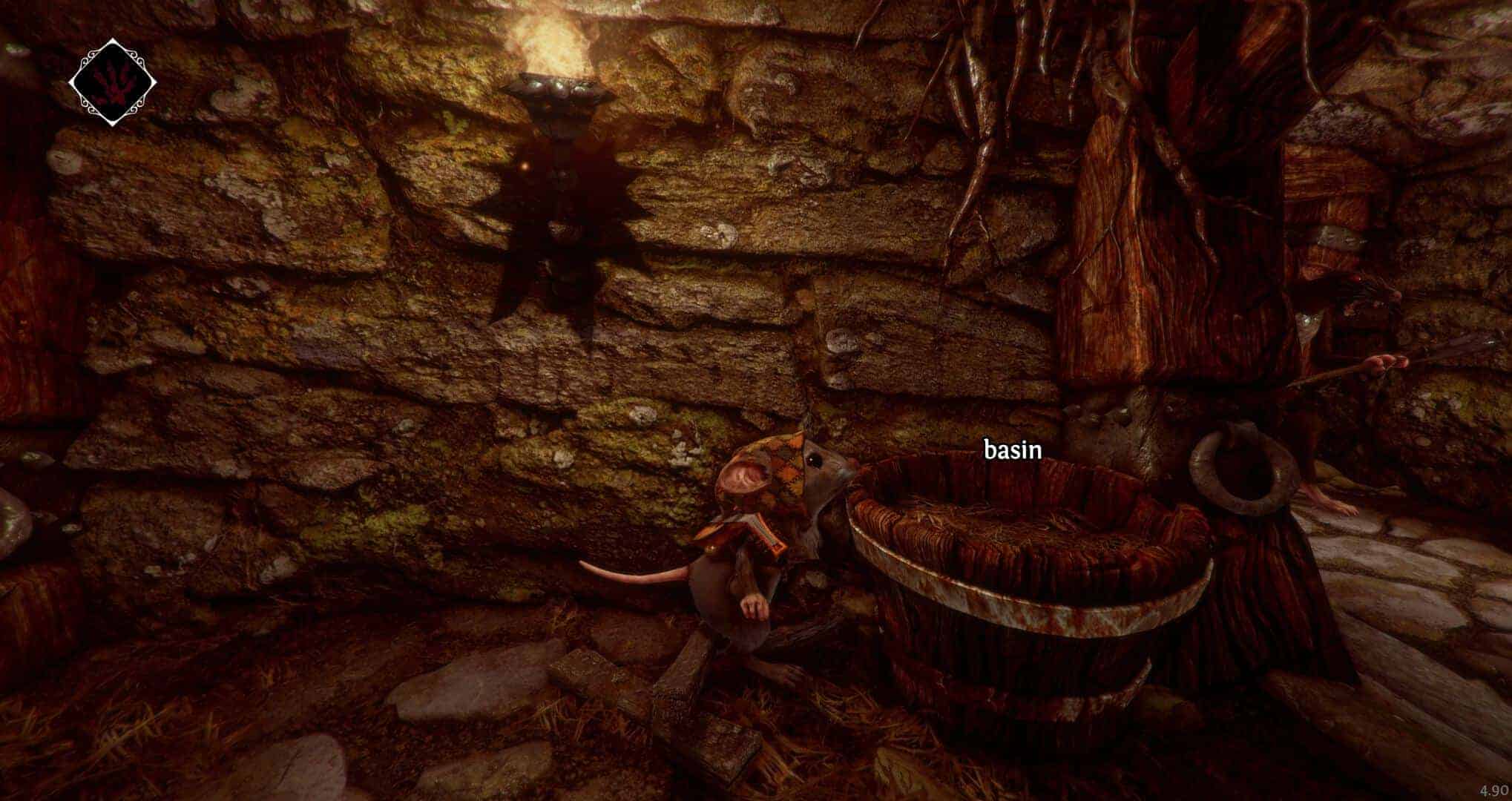 Attention, toutefois. Courir a un prix. Celui d’une jauge d’endurance couplée à une jauge de vie, qu’il faut veiller à bien remplir en dénichant de la nourriture ci et là. Un système ingénieux qui rend les sprints de la souris extrêmement précieux et auxquels on recourt avec prudence. Heureusement (ou pas), l’I.A. des rats ne vole pas bien haut et il suffit généralement de se soustraire à leur regard et de se cacher dans n’importe quel contenant pour les semer. Vous l’aurez compris, Ghost of a Tale s’avère plus riche qu’au premier abord, sans être complexe. Quant à la sensation d’être complètement perdu et à l’absence d’indications, elle se voit récompensée par l’exploration du joueur, qui peut ainsi accéder à des cartes ou des compétences rendant la tâche plus facile.