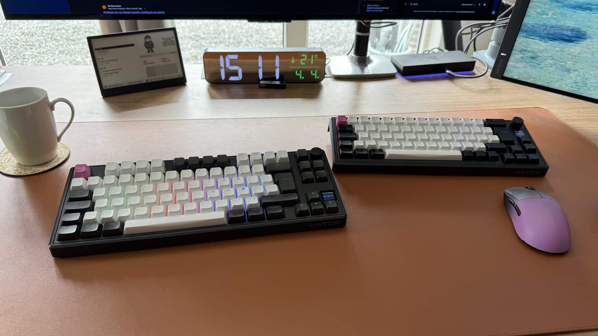 Le véritable choc survient dès la première pression sur une touche. J’ai utilisé des dizaines de claviers mécaniques, mais celui-ci est à part. Les switchs Hator Aurum Vanilla Silent sont une révélation : j’ai eu l’impression de taper sur des nuages. C’est presque totalement silencieux, au point que mon entourage ne remarque même plus quand je rédige mes articles tard le soir. Forcément, le feeling est un peu différent d’un switch classique ; c’est un peu moins “incisif”, un peu plus feutré, mais le confort de frappe reste exceptionnel.