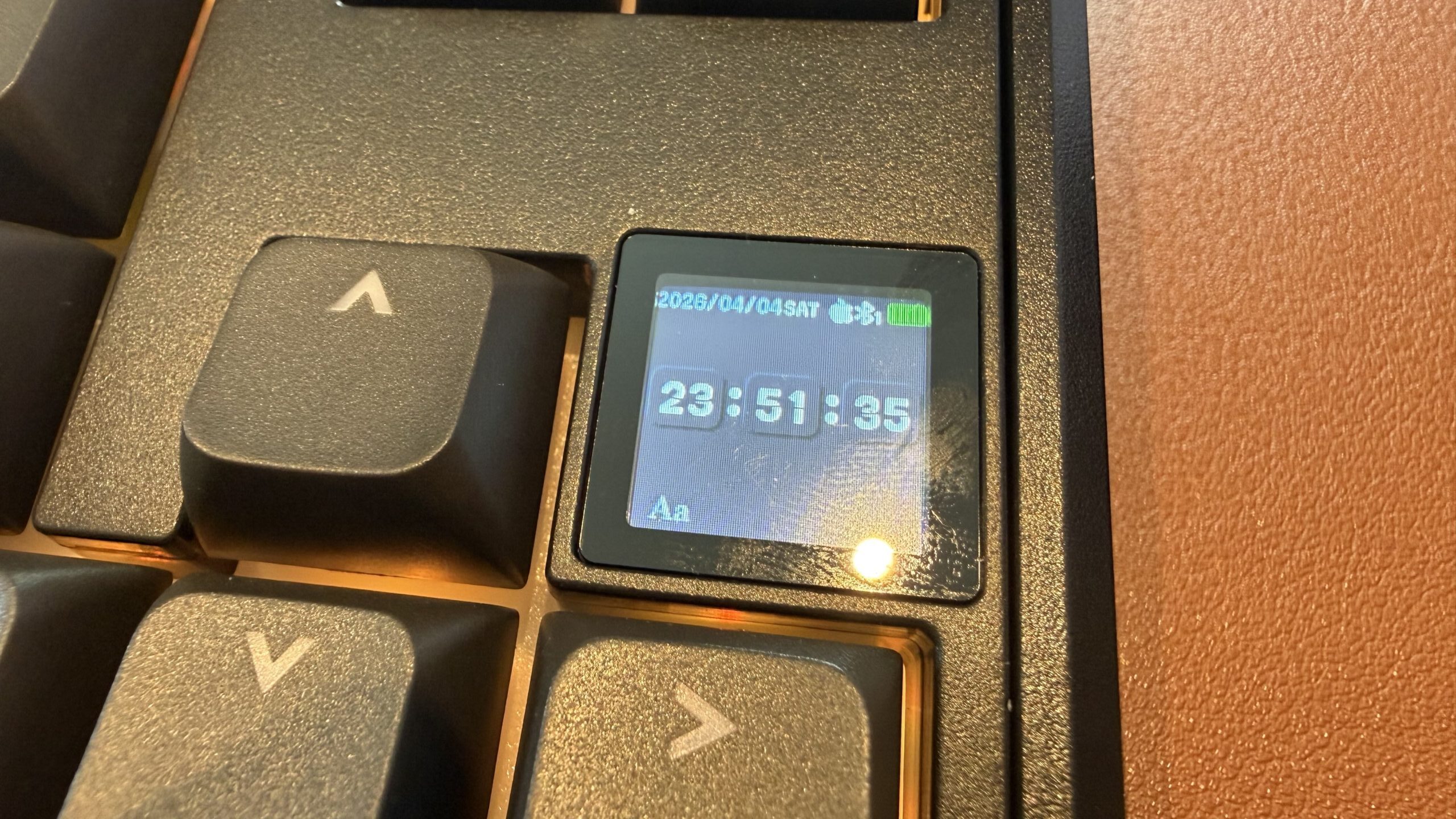 Le design reste sobre avec des finitions exemplaires. J’ai particulièrement apprécié la texture des touches en PBT qui offre un grain très agréable sous les doigts, évitant cet aspect brillant et gras que l’on retrouve sur les claviers d’entrée de gamme. L’ajout de l’écran sur la partie supérieure droite apporte une touche de modernité indéniable, permettant de garder un œil sur les réglages sans avoir à fouiller dans un logiciel complexe.