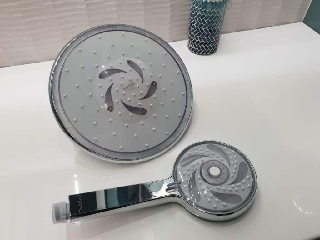 Un pommeau de douche moyen consomme environ 12L/min et la durée moyenne d’une douche estimée est de 5 minutes. Ce qui veut dire que nous consommons 60L par douche. Là ou la moitié serait suffisante. Partant de ce principe, et comme expliqué lors de mon test du pommeau Hydrao, cette start up française a décidé de créer un pommeau et maintenant aussi un ciel de douche, permettant de réduire la consommation, grâce à un mécanisme ingénieux de couleurs. Celui-ci vous permettant de savoir où vous en êtes dans votre consommation. Le tout de manière pédagogique et ludique. Je vous présente donc le pommeau Hydrao Aloé et le ciel de douche Yucca.