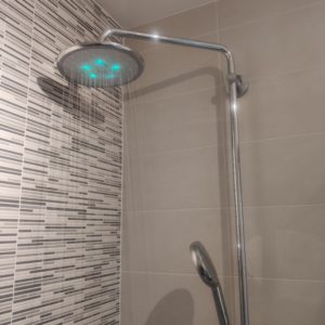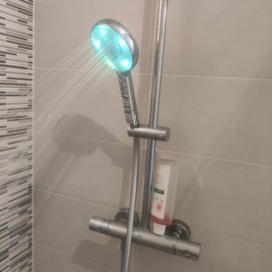 Le principe permettant aux pommeaux de fonctionner est assez simple. En effet, grâce à une turbine alimentée par l’eau, le pommeau Hydrao Aloé et le ciel de pluie Yucca sont autonomes et permettent de faire changer la couleur du pommeau. Ces couleurs définissant des seuils de consommation que vous pouvez définir. Par défaut, ce sera vert jusqu’à 10L, bleu jusque 20L, rose/mauve jusque 30L, rouge jusque 40L et enfin rouge clignotant au-delà. Ainsi vous saurez à tout moment où vous en êtes dans votre douche. Permettant à chacun de maîtriser sa consommation et de se lancer des petits défis. Ma fille par exemple est très fière de rester dans le seuil de la première couleur pour ses douches.
