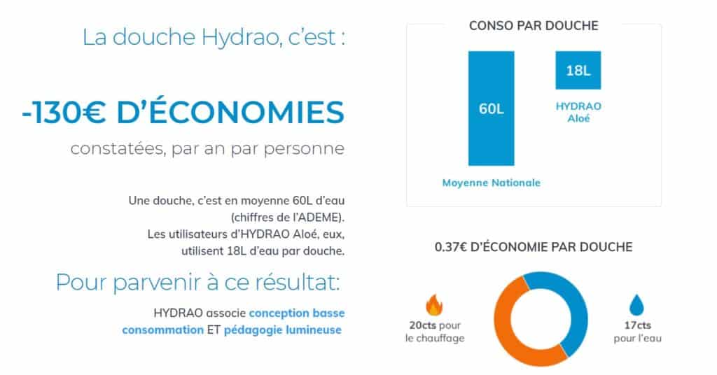 J’ai beaucoup voyagé et comme beaucoup de gens, j’ai tendance à plus consommer lorsque je suis à l’hôtel. Pas étonnant donc qu’Hydrao soit de plus en plus choisi pour équiper les hôtels et autres grosses nouvelles constructions. En passant d’une douche de 60L à une douche de 20L par jour, vous économiserez jusqu’à 130 euros par an et par personne. Autant dire que les 170 euros nécessaires à l’achat du ciel de douche et du pommeau seront vite rentabilisés.
