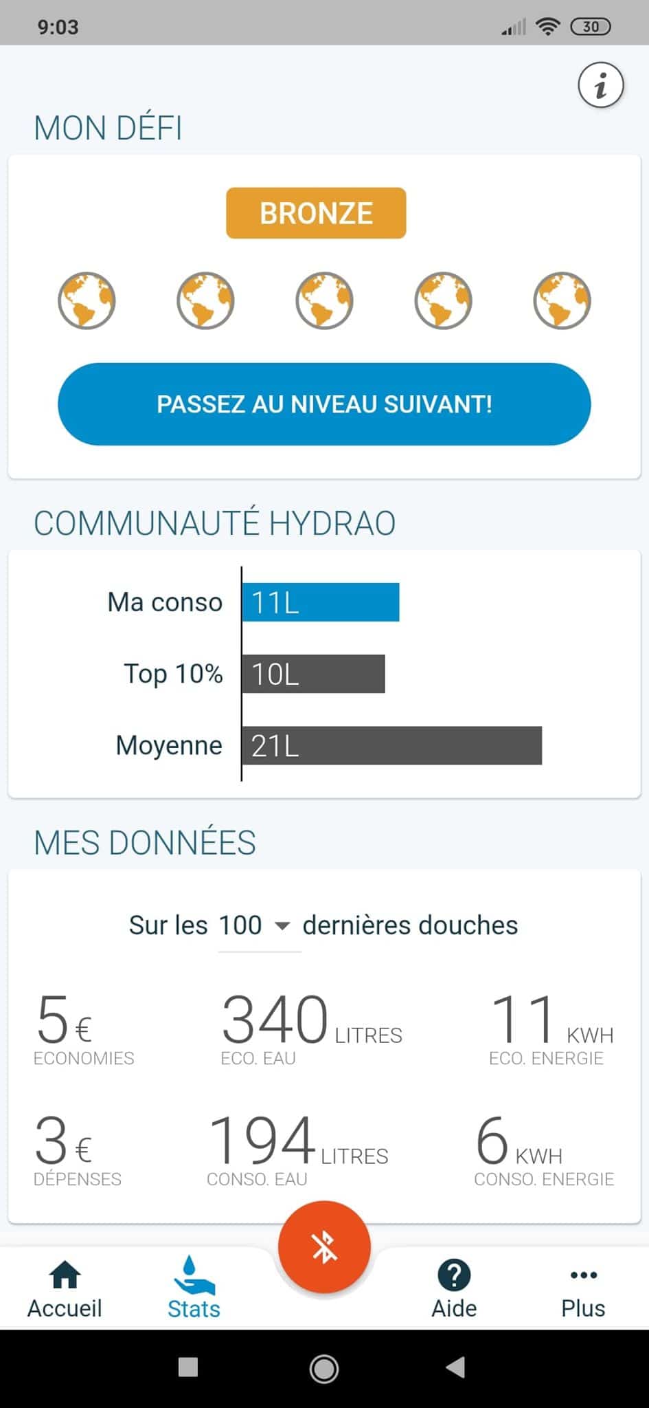Mais tout cela ne serait rien sans une application permettant de mesurer vos volumes consommés au quotidien. Grâce au Bluetooth intégré dans le pommeau et alimenté par la turbine, celui-ci se connectera à votre smartphone via l’application Hydrao. Bien que cette connectivité ne soit pas indispensable, elle s’avère vite très utile. Il m’a été facile l’autre jour par exemple de prouver à mon filleul que ses douches étaient fort longues. Ainsi, alors que notre consommation moyenne est de 12L pour une douche (oui on est rapides), lui avait atteint les 42L. Pas tant que ça si on y pense car cela représente un peu plus de 4 minutes de douche. Il a cependant réussi depuis lors à baisser sa consommation tout en trouvant cela amusant et peu contraignant.