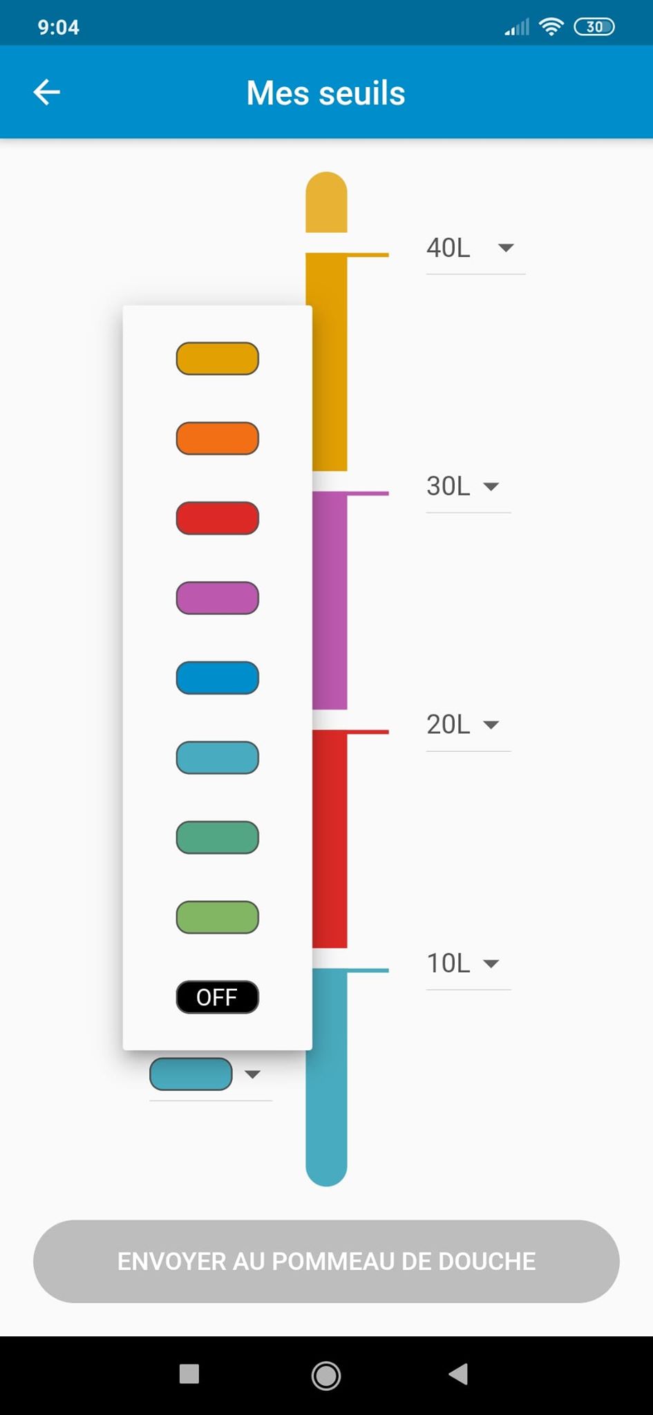 C’est également via l’application que vous pourrez changer les différentes couleurs pour les seuils avec 8 couleurs disponibles. De plus, outre la possibilité de voir vos stats de consommation mais aussi vos économies réalisées sur les 500 dernières douches, vous pourrez également définir des défis. En baissant vos seuils de consommation, vous obtiendrez des médailles. Rendant le tout encore plus ludique pour tous.