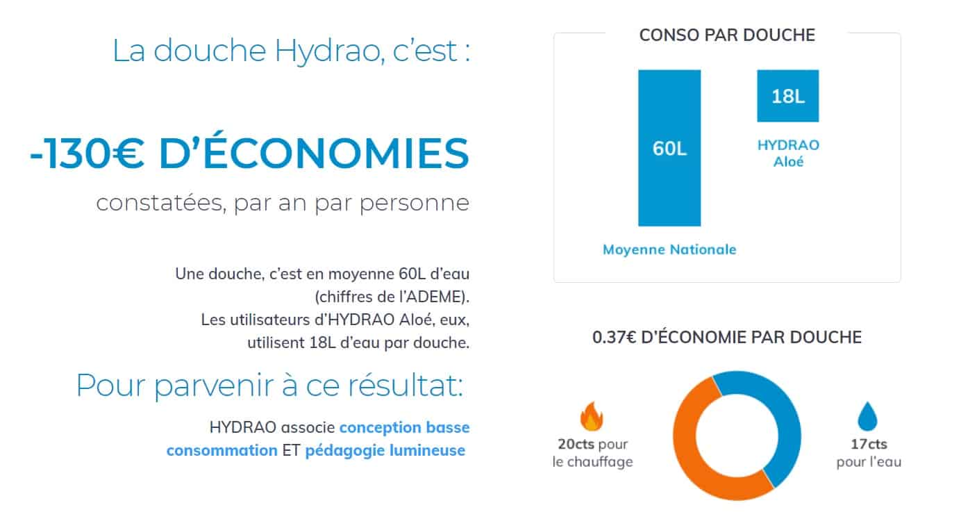 J’ai beaucoup voyagé et comme beaucoup de gens, j’ai tendance à plus consommer lorsque je suis à l’hôtel. Pas étonnant donc qu’Hydrao soit de plus en plus choisi pour équiper les hôtels et autres grosses nouvelles constructions. En passant d’une douche de 60L à une douche de 20L par jour, vous économiserez jusqu’à 130 euros par an et par personne. Autant dire que les 170 euros nécessaires à l’achat du ciel de douche et du pommeau seront vite rentabilisés.