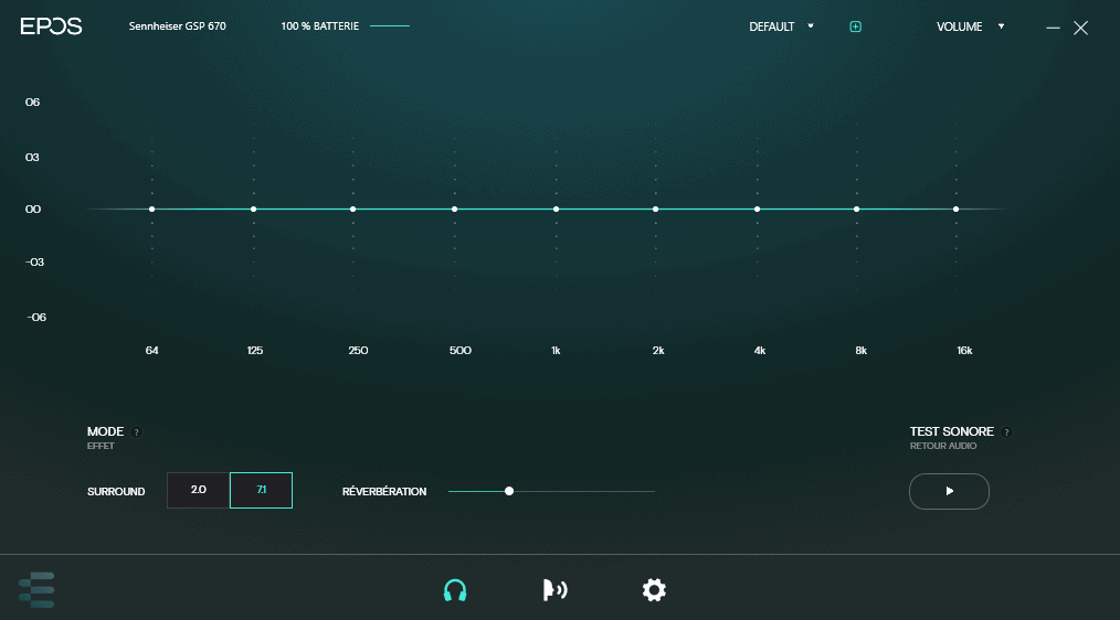 Rien de compliqué : on branche le dongle dans un port USB libre, on allume le casque et le tour est joué. EPOS a développé son petit logiciel, appelé EPOS Gaming Suite qui détectera automatiquement votre casque. De là, vous pourrez mettre à jour le dongle, le firmware de votre EPOS GSP 670 mais aussi régler quelques paramètres. Je dis bien “quelques” car EPOS ne s’embête pas à vous proposer des réglages que vous n’allez jamais utiliser. Ainsi, vous allez pouvoir sélectionner parmi les égaliseurs prédéfinis ou bien en régler un sur mesure. Choisir aussi l’effet Surround du 2.0 ou du 7.1 ou encore déterminer le niveau de réverbération du son. La réverbération, pour ceux qui ne sauraient pas, c’est un effet semblable à l’écho qui vous permet d’affiner encore plus le 7.1. Personnellement, j’ai directement activé le 7.1 et c’est un délice pour les oreilles.