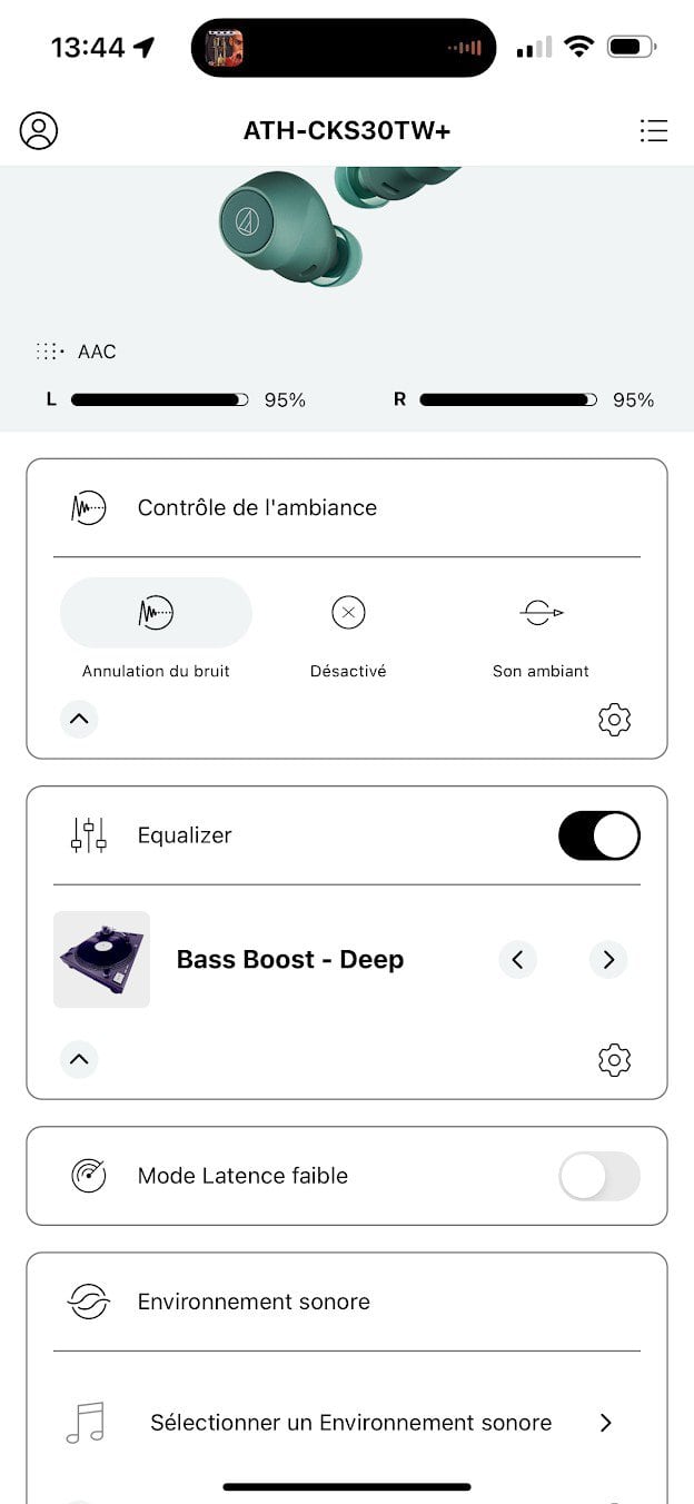 J’ai fait une première écoute avec l’album rap Temps mort de Booba que je connais par cœur et le son n’est pas si bon que ça. Les voix manquent de clartés et les bass ne sont pas très énergiques. J’ai téléchargé l’application maison afin d’aller voir s’il n’y a pas de réglages à configurer, une mise à jour à faire… et là, je me suis rendu compte que le système ANC n’était pas activé.