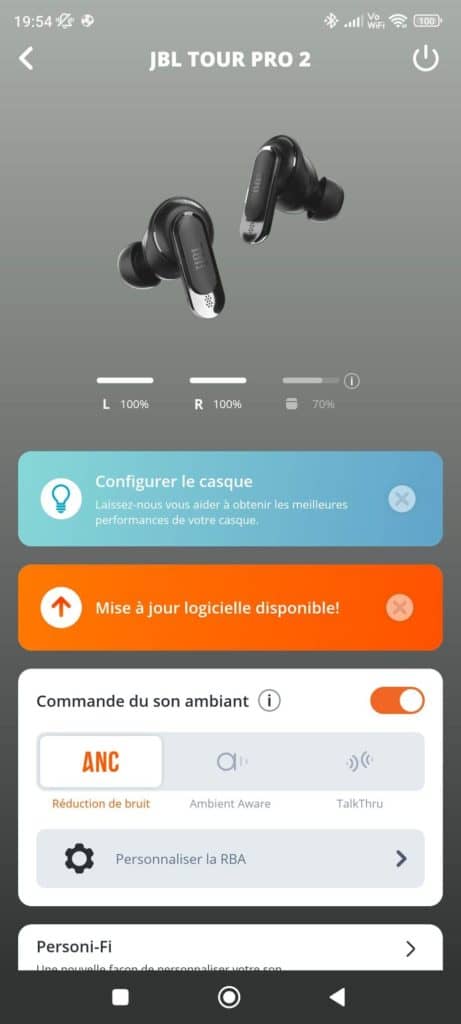 L’appairage se fait réellement hyper facilement, il vous suffit d’activer le Bluetooth sur votre smartphone, d’ouvrir le boitier, de trouver les écouteurs dans la liste et c’est parti. Vu le boitier intelligent, l’app JBL est un peu moins indispensable, mais je ne peux que vous conseiller de l’installer quand même. Celle-ci vous permettra, en effet, lors de votre première utilisation de calibrer les écouteurs pour un son optimal. Vous aurez bien sûr accès à toutes les autres fonctions classiques comme l’état de la batterie, les mises à jour disponibles, l’activation ou désactivation de l’annulation active de bruit, l’égaliseur…