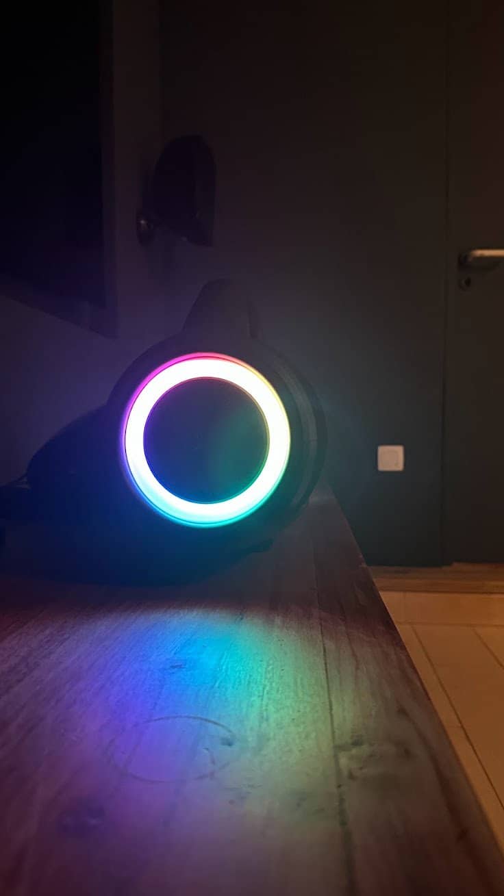 dispose de LED RGB capables de synchroniser sur le rythme de la musique pour proposer un show de lumières.Pour les fonctions plus avancées : il est possible de brancher des micros pour lancer un karaoké ou encore une guitare électrique. Tronsmart a également prévu l’usage de plusieurs enceintes simultanément car on peut connecter jusqu’à 100 dispositifs. Évidemment, 100 enceintes, c’est un peu dingue, mais en avoir 2 pour proposer un rendu stéréo reste très agréable.