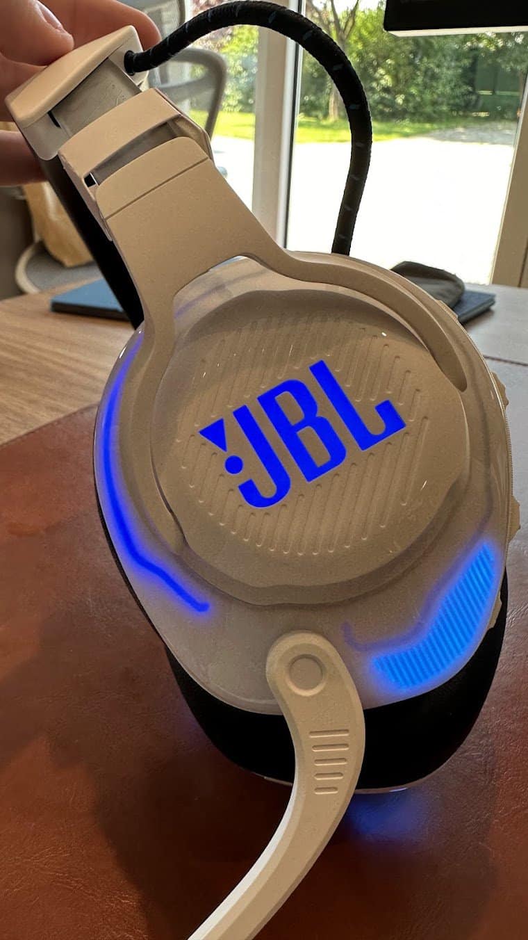 En déballant le JBL Quantum 910P, on tombe assez vite sous le charme. Le look gamer est assumé, mais l’ensemble livré dans une belle pochette reste assez sobre et qualité. Sur la tête, le casque est léger, équilibré et les mousses confortables englobent parfaitement mes grandes oreilles. L’isolation acoustique fonctionne merveilleusement bien et je me retrouve littéralement dans une petite bulle.