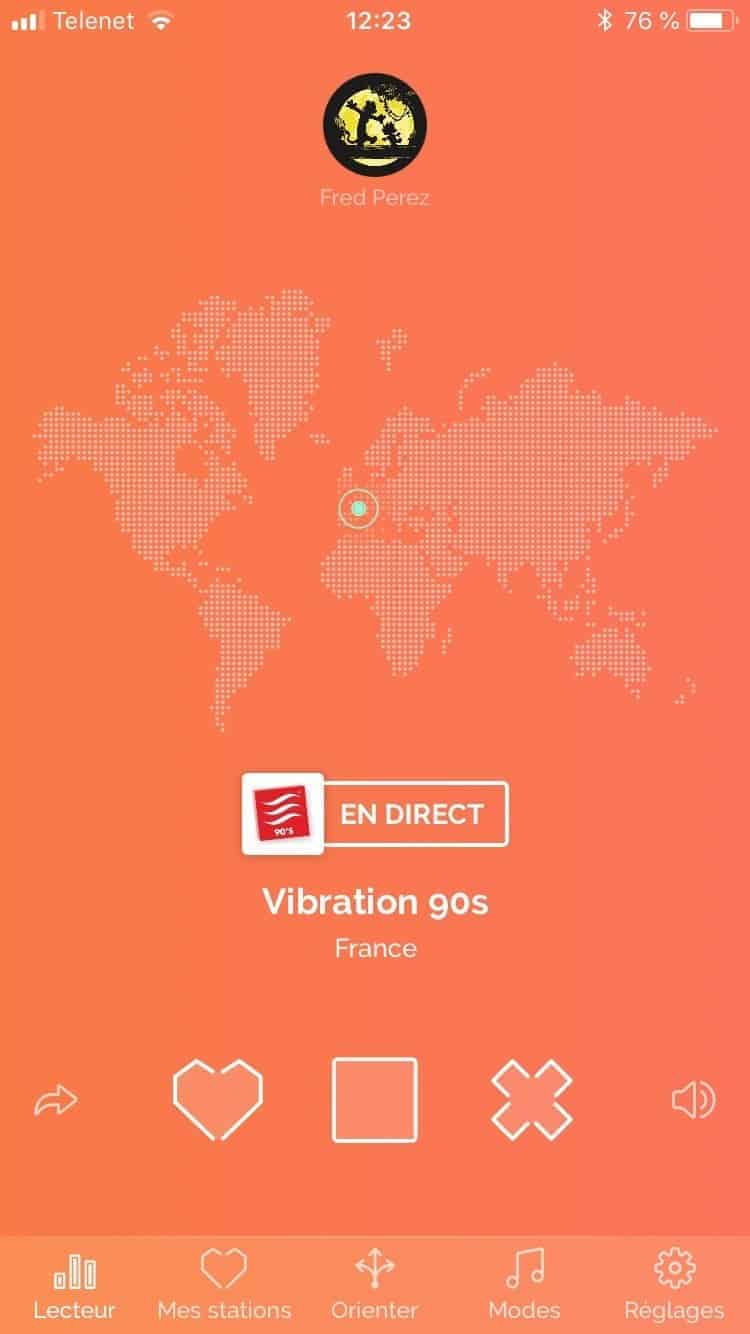 Ceci étant fait, vous pouvez alors couper votre smartphone et profiter de la musique. En n’oubliant pas de régulièrement presser le coeur pour sauver une station qui vous plaît ou la croix pour passer celle-ci. Je suis d’ailleurs déçu qu’il n’y ait pas un bouton “next” qui me permettrait de changer de station sans pour autant que le Prizm pense que je n’aime pas celle-ci.