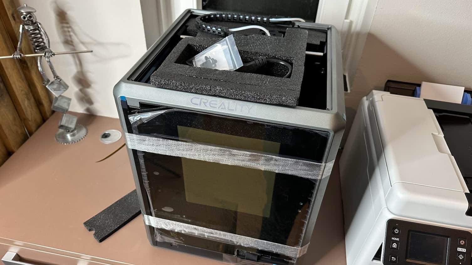 Comme indiqué dans l’introduction : il n’y a presque aucune manipulation à réaliser pour mettre en route l’imprimante 3D Creality K1: on déballe la boite, on enlève les mousses de protection et on récupère l’imprimante presque prête à l’emploi.