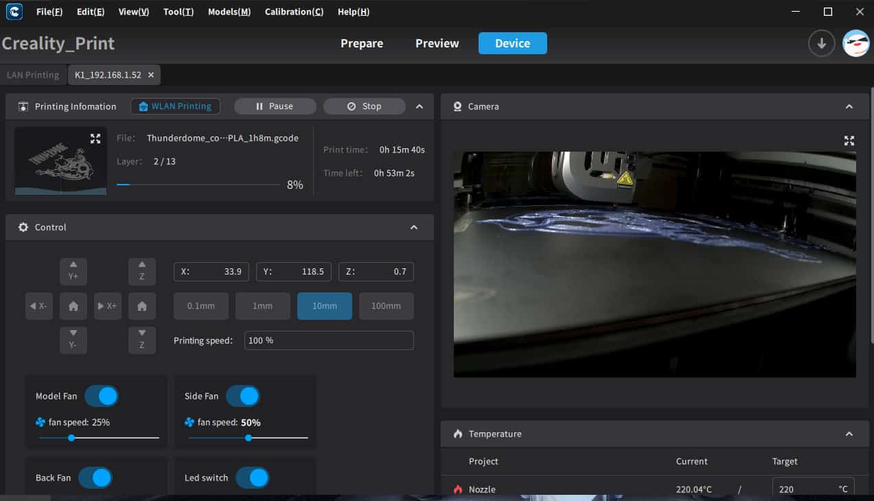 Bref : c’est vraiment canon et l’application me permet en outre de suivre mon impression, son évolution en rendu 3D, la caméra et même de piloter les ventilateurs ou la lumière.