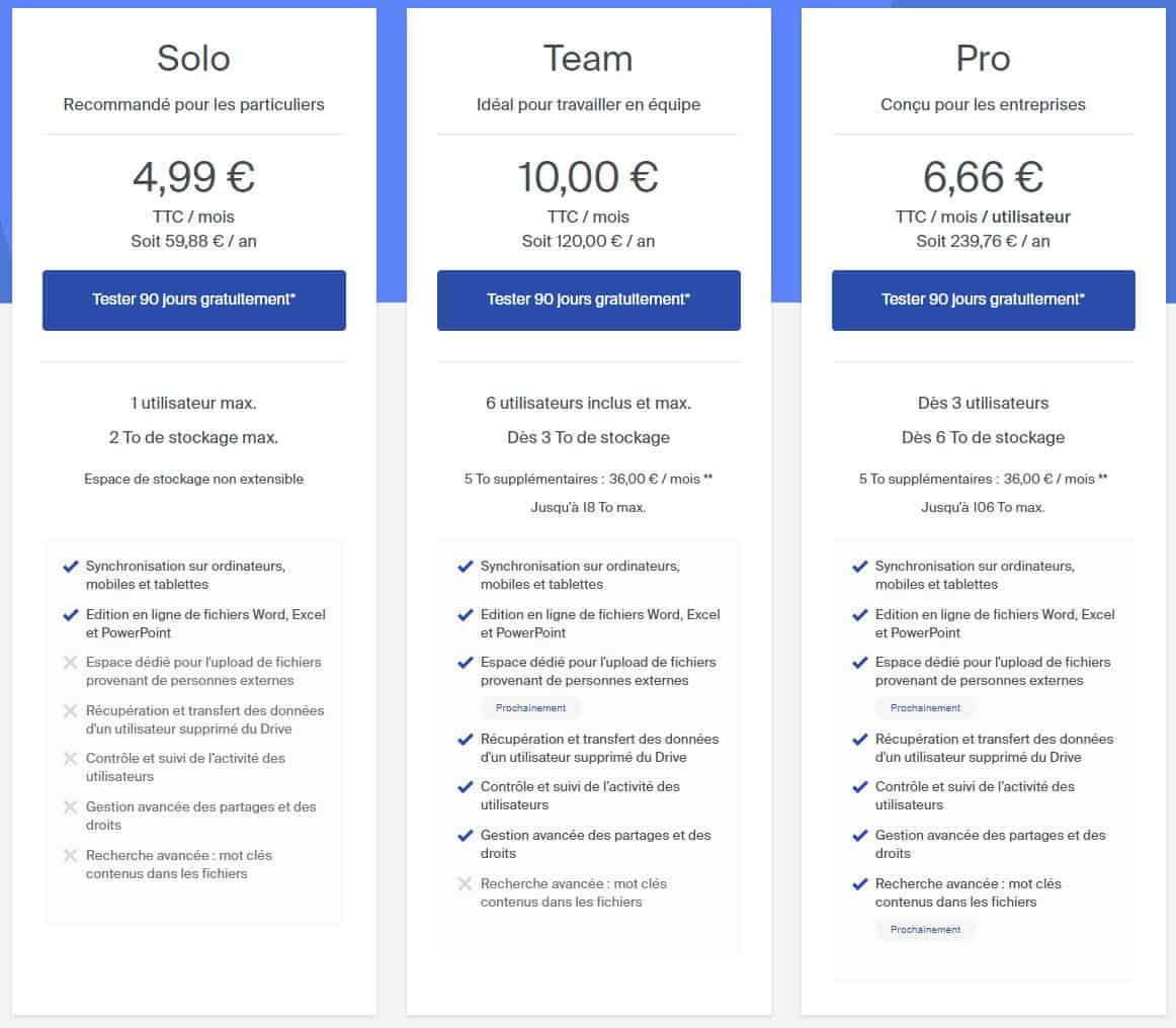 Contrairement à Dropbox, pas de formule gratuite chez kDrive, mais je ne suis pas certain que ce soit une si mauvaise chose finalement car comme l’indique l’adage : quand c’est gratuit, c’est vous le produit !