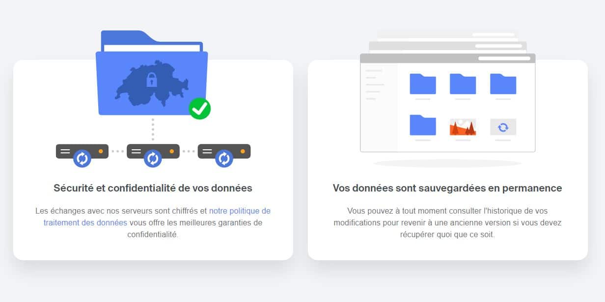 - Sauvegarde et sécurité : Votre instance kDrive bénéficie de sauvegardes automatiques, et vos données sont répliquées sur trois emplacements physiques différents pour une sécurité optimale.