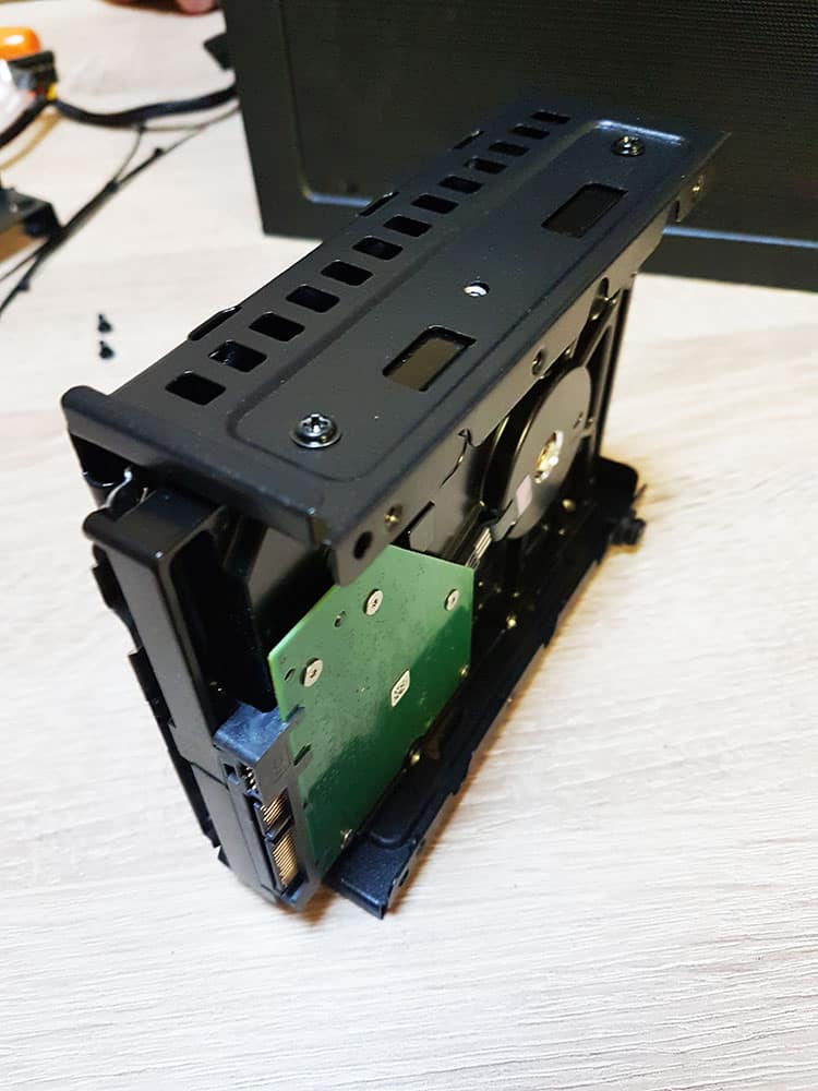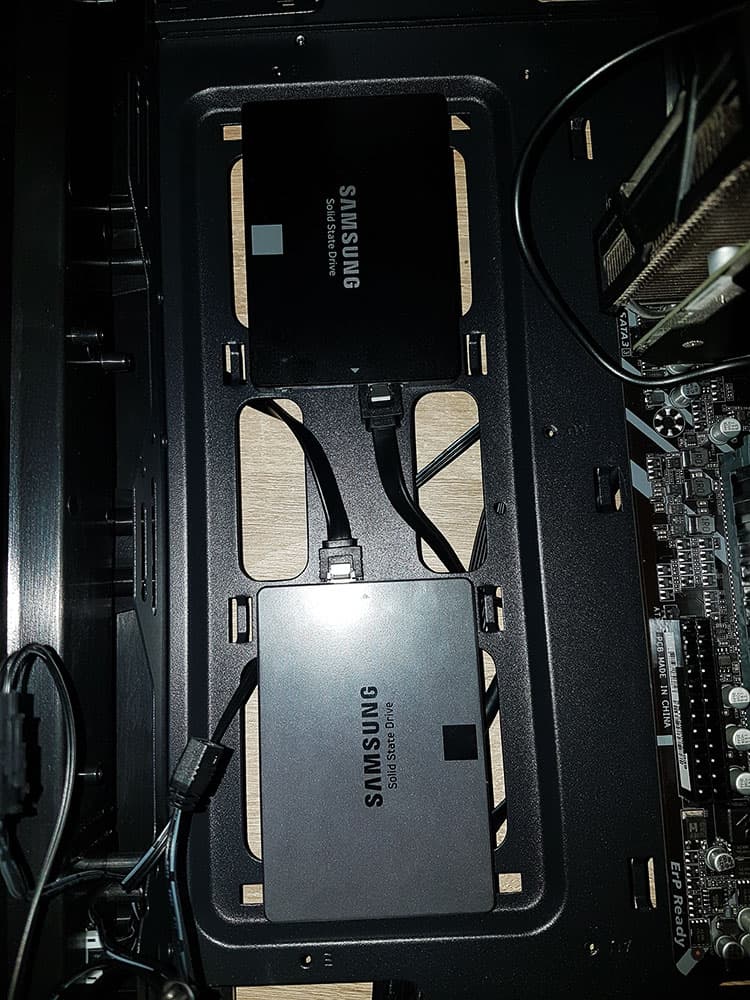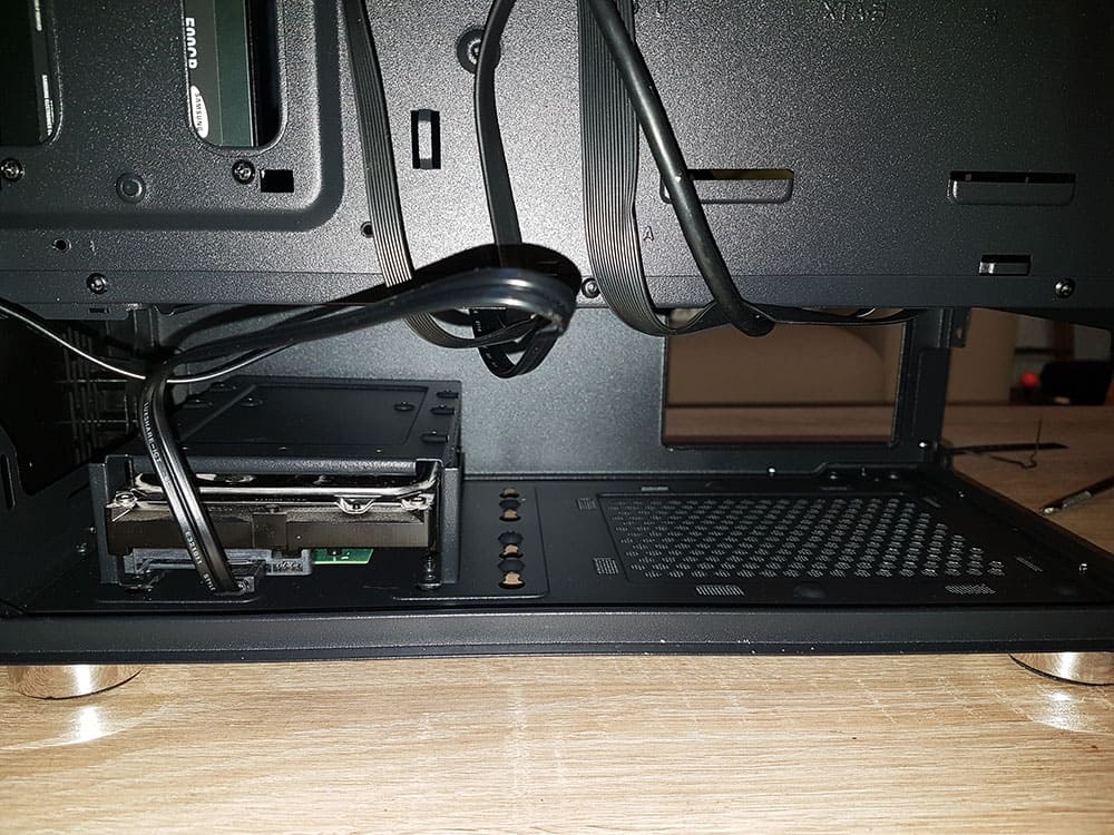De plus, les cartes graphiques peuvent également être installées verticalement, à condition qu’elles soient à largeur double, à l’aide du support fourni et d’un câble de montage vertical PCI-E. Bref, c’est parfait si vous voulez faire du Crossfire. Concernant mes disques durs, j’ai installé deux SSD et un disque classique. Disposant encore de beaucoup de place, j’ai choisi de placer mes SSD à côté de ma carte mère. Ce qui me permet de pouvoir les contempler à travers le panneau latéral en verre. Mon bon vieux HDD est quant à lui caché sous le carénage dans le bas de la tour à côté de mon alimentation. D’ailleurs le boîtier Kolink Outline est équipé d’un socle détachable qui permet de placer ses disques super facilement. Un autre détail très cool !