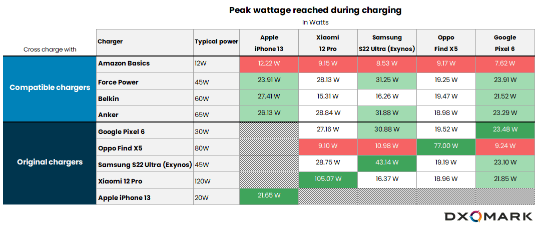 DXOMARK cross-charging tests – peak wattage