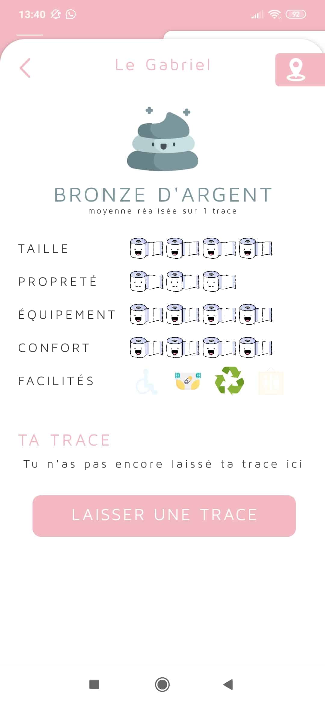 Vous pourrez ensuite laisser un petit commentaire si vous le souhaitez et suite à votre avis et ceux des autres utilisateurs de la plate-forme, les toilettes de l’établissement se verront attribuer un titre. Les meilleures de la zone seront notées bronze d’or, bronze d’argent ou encore bronze de bronze, tandis que celles avec une note basse seront nommées… Caca mou.