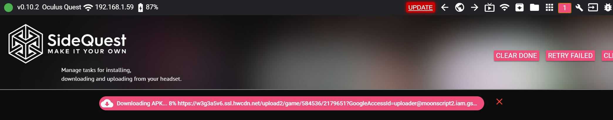 Le point vert en haut à gauche de l’écran indique que votre casque est branché et bien reconnu par SideQuest. Dans le cas contraire ce point est orange.